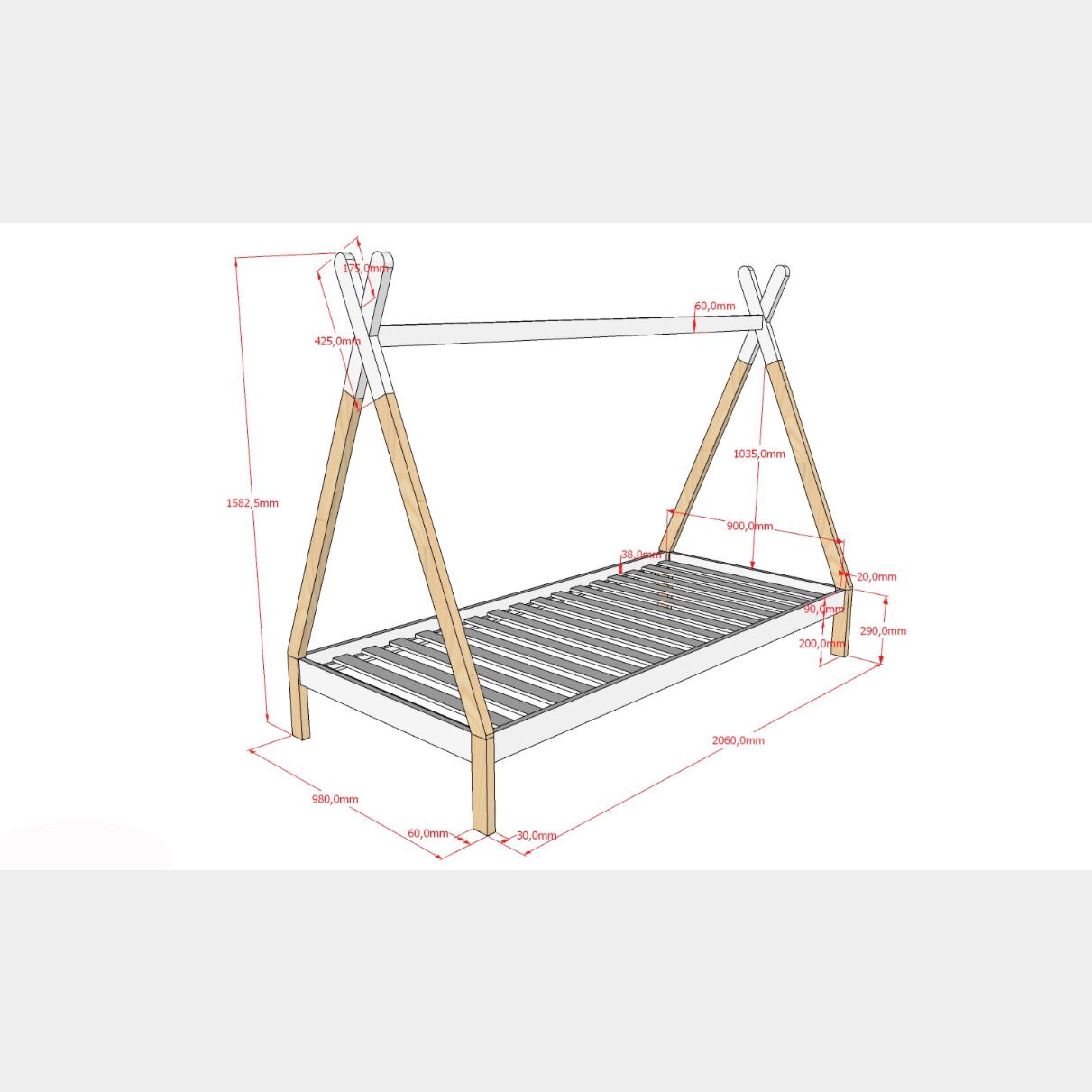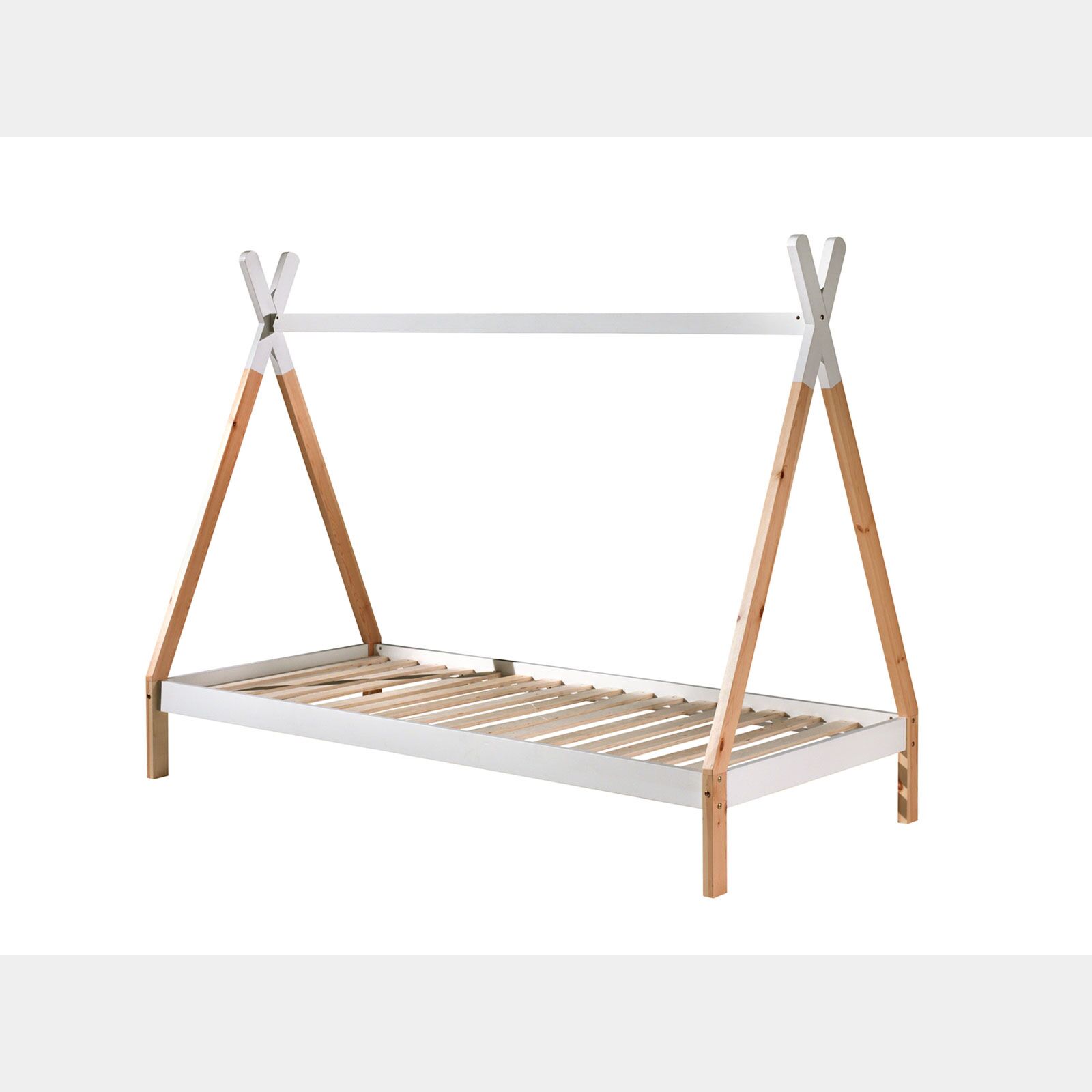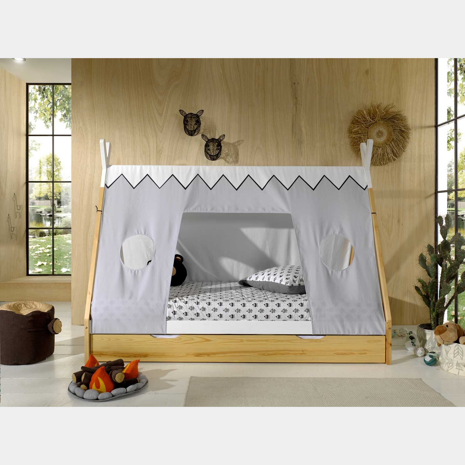 Letto singolo montessoriano per camerette, design tenda indiana, Pino naturale e Bianco laccato