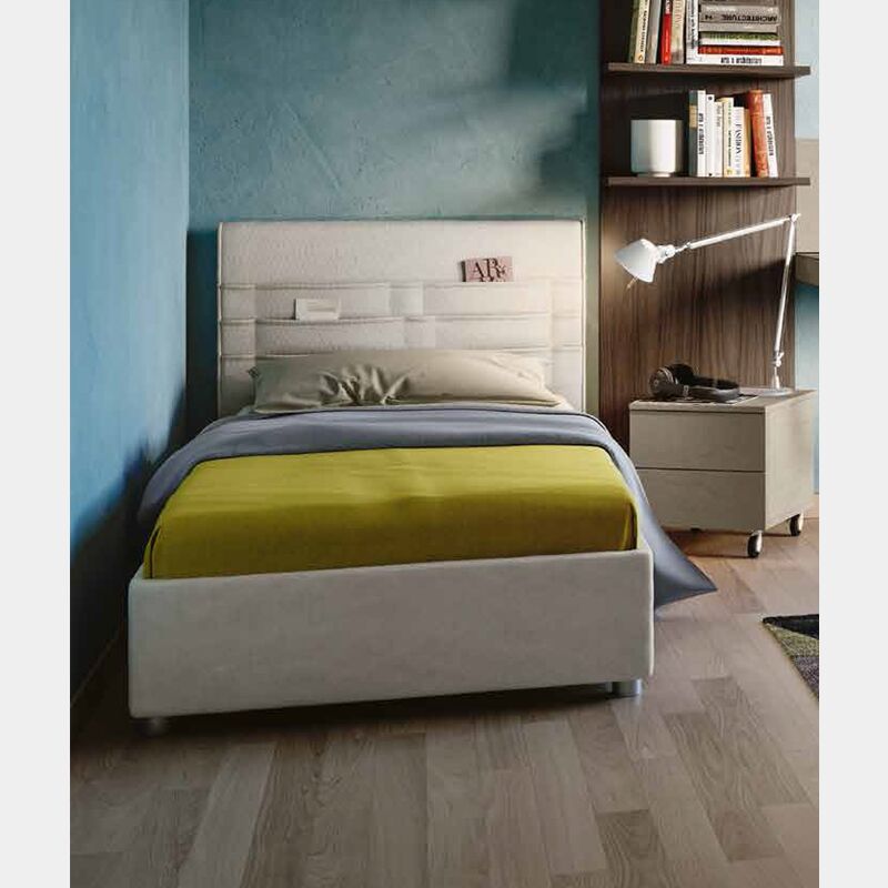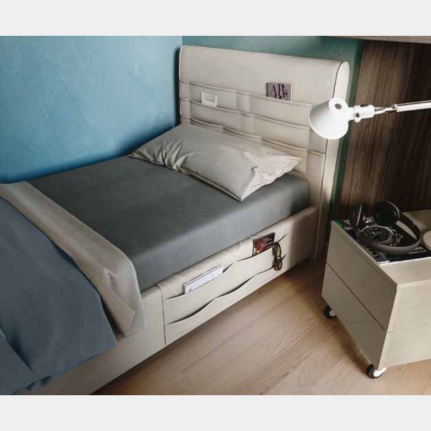 Un letto dalle mille risorse che offre tutta la comodità necessaria. Il letto singolo presenta infatti delle capienti tasche in testata e giroletto per garantire praticità e funzionalità al 100%. Il giroletto è in tessuto sfoderabile, la finitura proposta è Nebbia, grazie però ad un'ampia gamma di tessuti è possibile personalizzarlo e renderlo unico, perfetto per la tua cameretta.