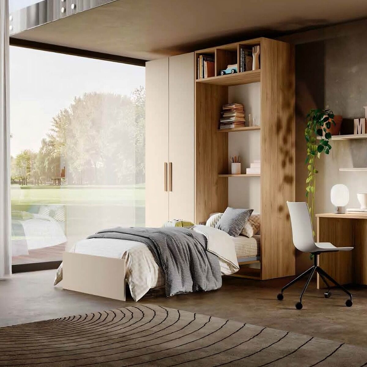 Letto singolo salvaspazio verticale con armadio 2 ante battenti, Noce biondo e Orzo