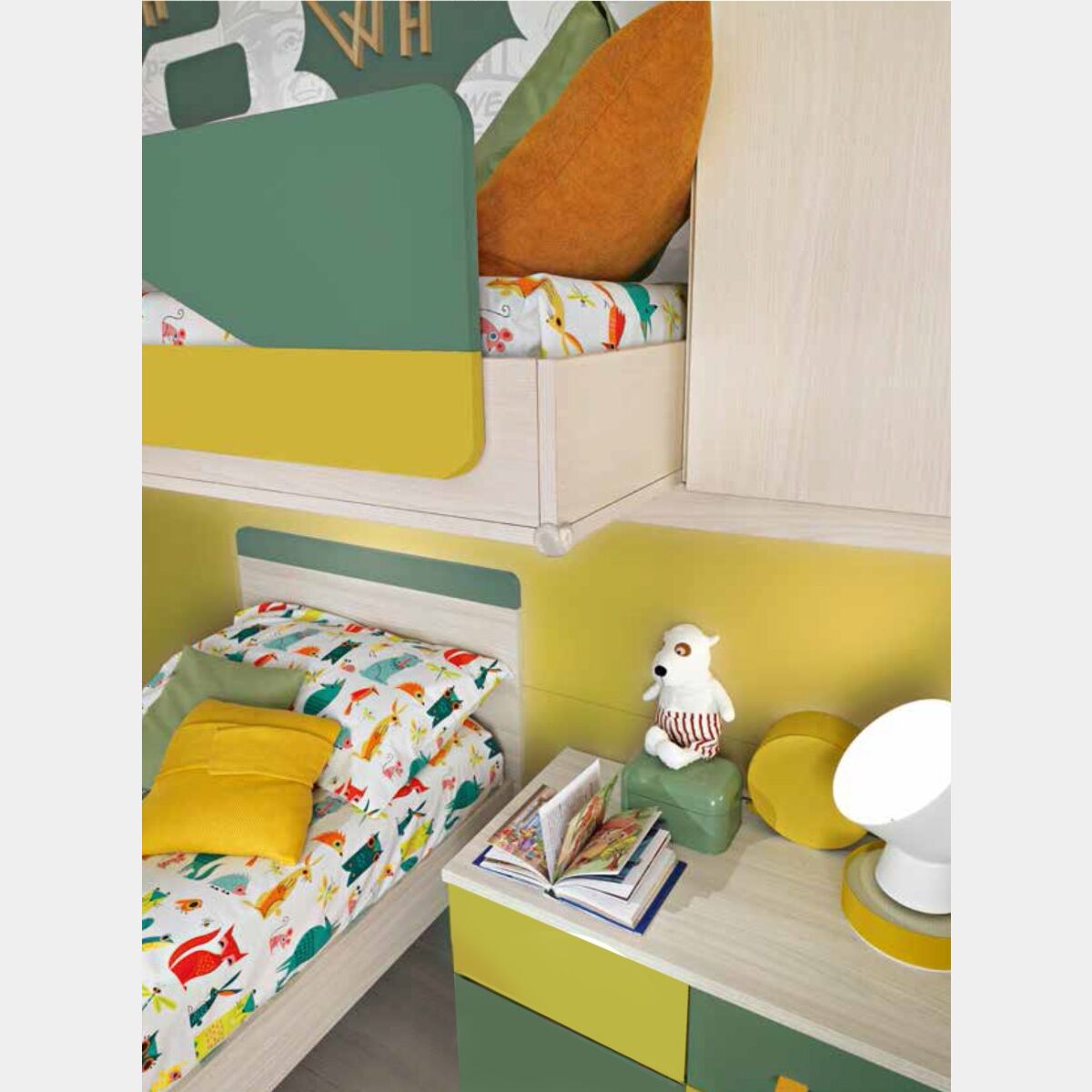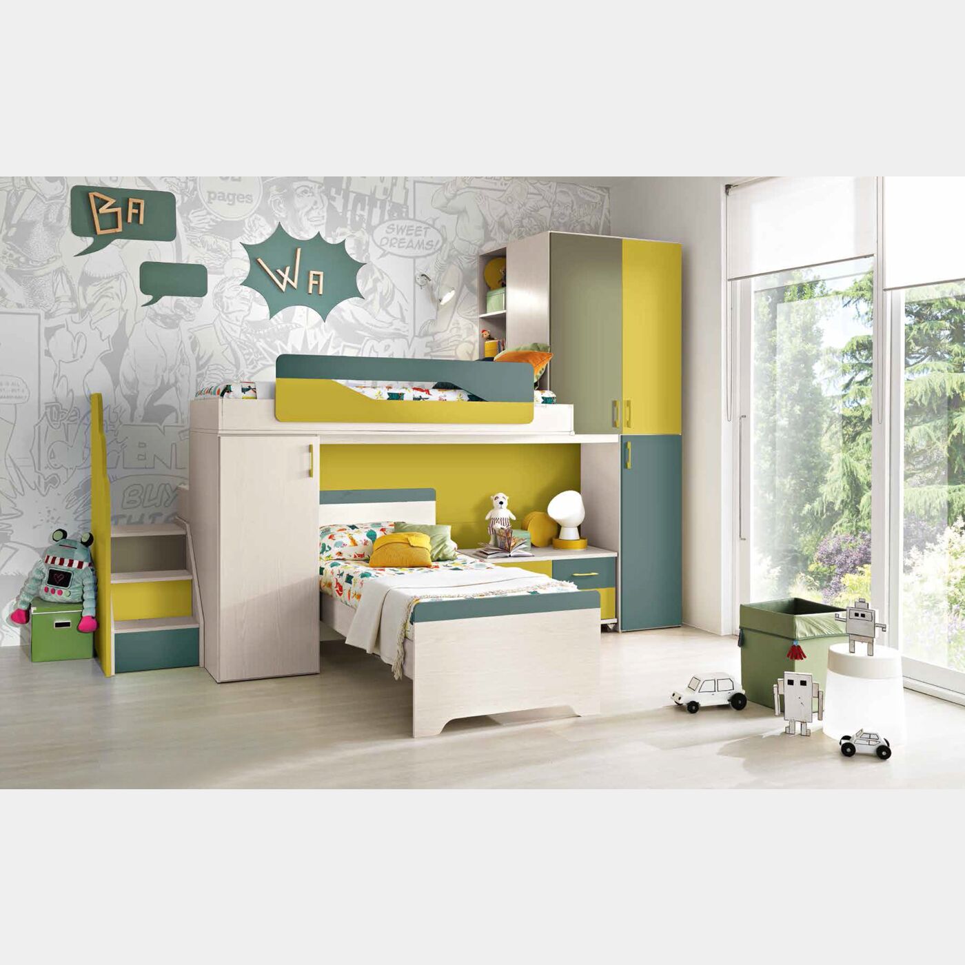 Misure: L.90 H.87 P.198.6Ti serve anche il materasso? Proponiamo un materasso acqua foam in espanso all'aloe H.18 oppure se vuoi dormire comodo materasso in memory H.20 o H.24. Completamente sfoderabili lavabile in lavatrice, antiacaro.Cameretta completa: Cameretta con soppalco Chiara, finitura Betulla, Senape, Petrolio e Salvia