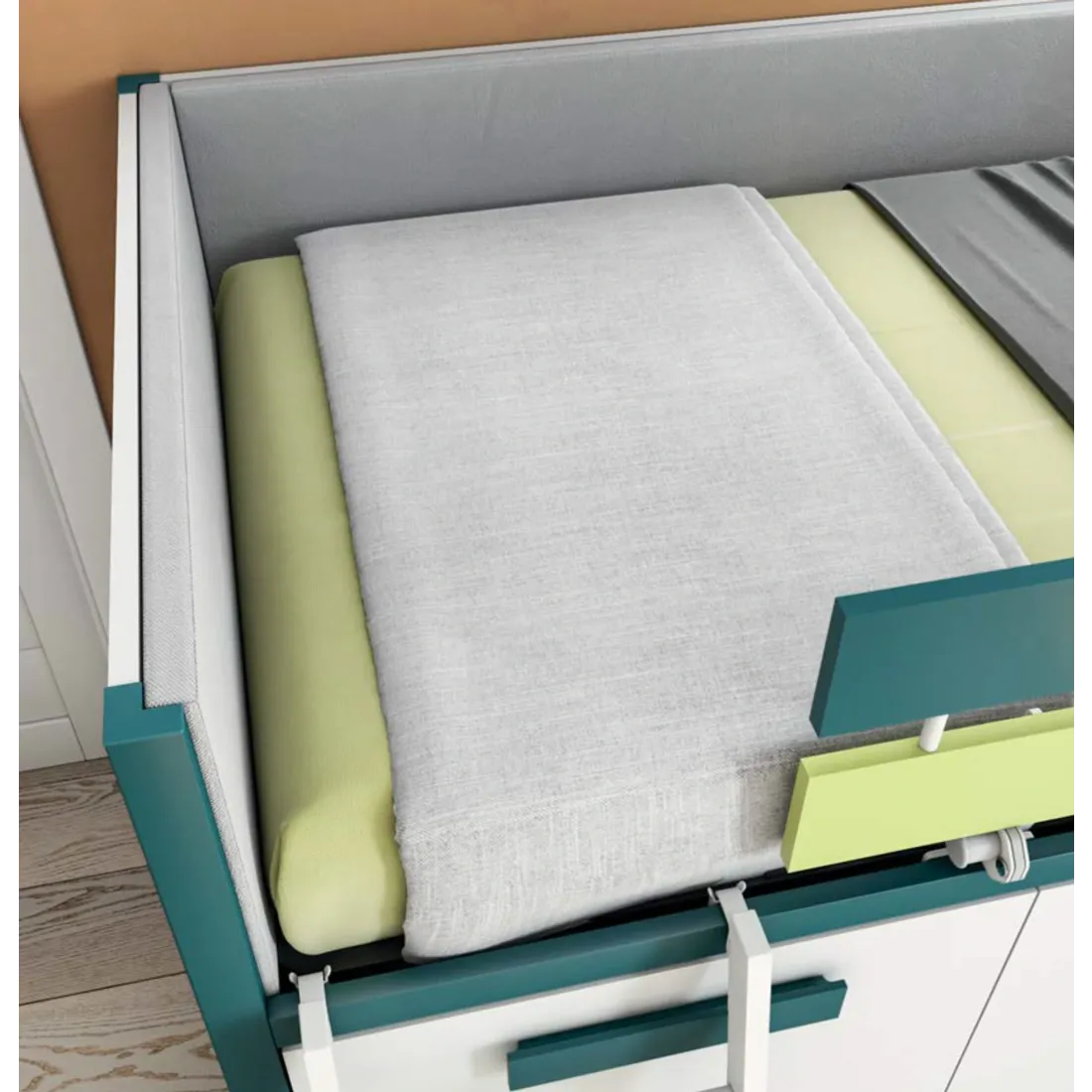 La struttura prevede un comodo e sicuro posto letto dotato di scaletta in alluminio e protezione e 3 cestoni estraibili con tubi appendiabiti, a cui è possibile aggiungere un ripiano centrale.