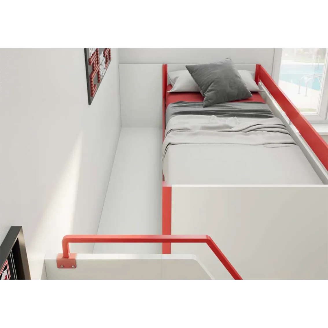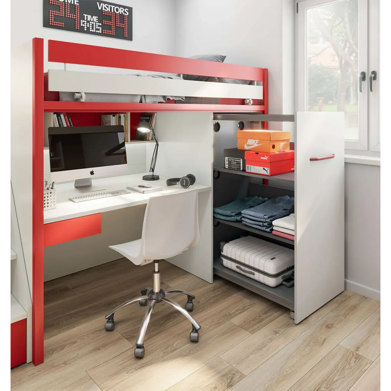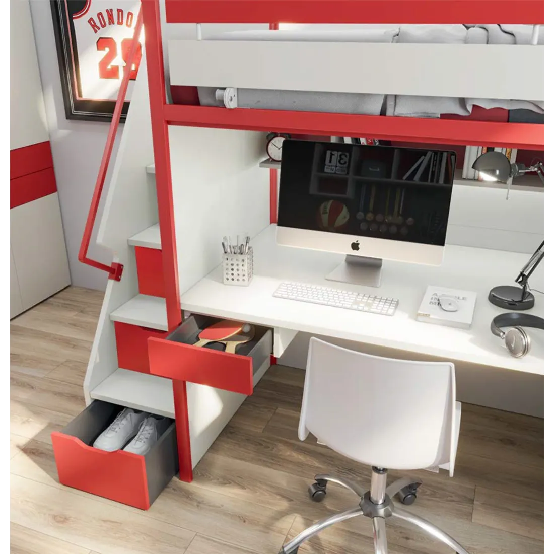 Letto Sky con passerella e scrivania, finitura Bianco luce e Rosso fiamma
