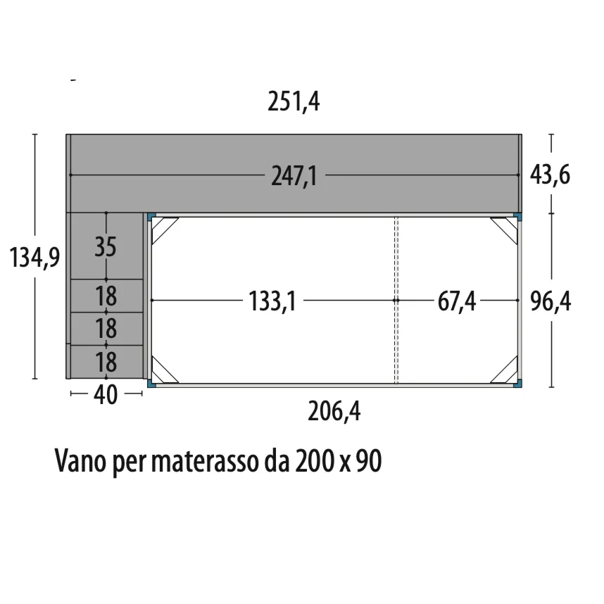 • Rete: a doghe di legno con telaio in tubolare di metallo 4x3 cm, verniciatura a polveri epossidiche color grigio. Dimensioni 90x200.