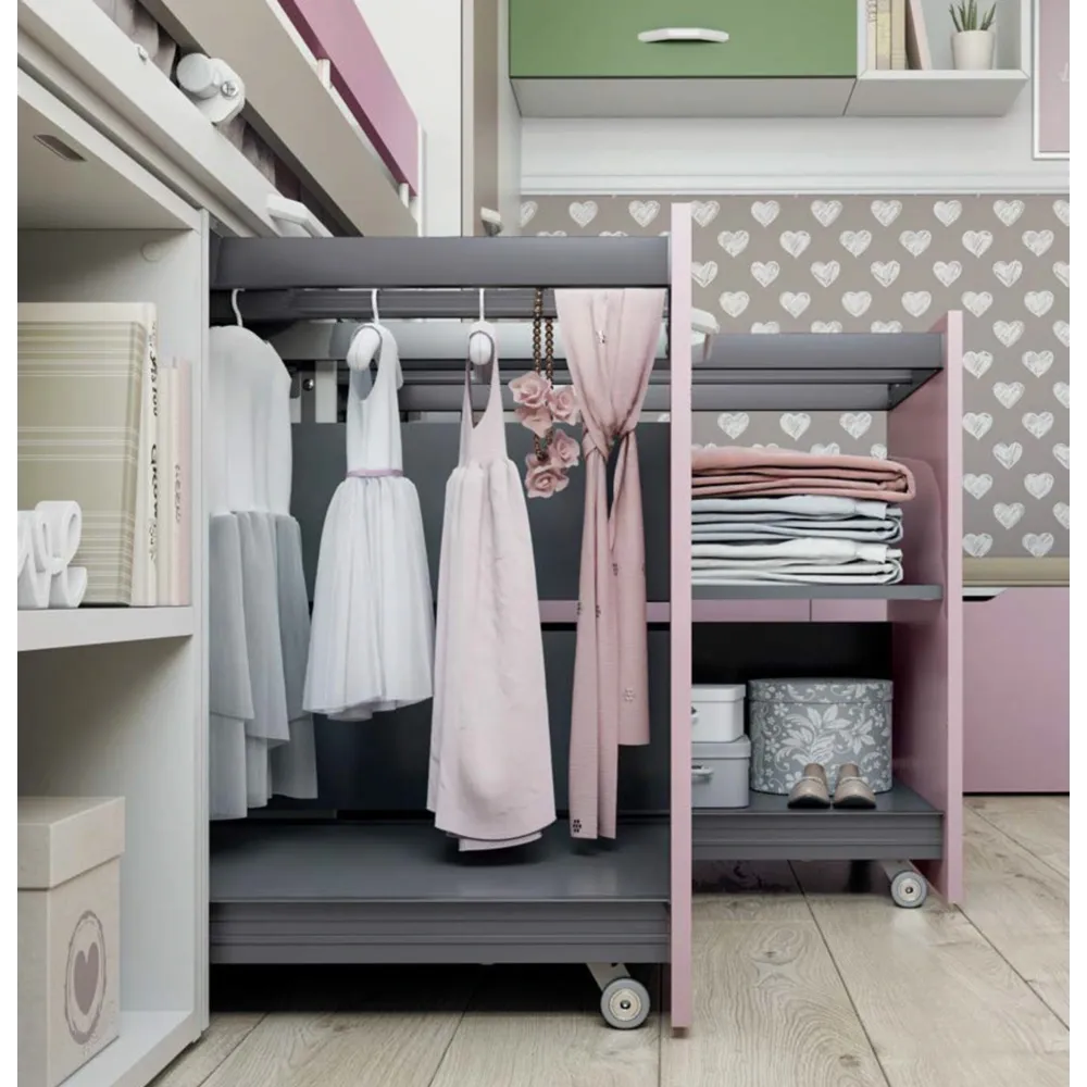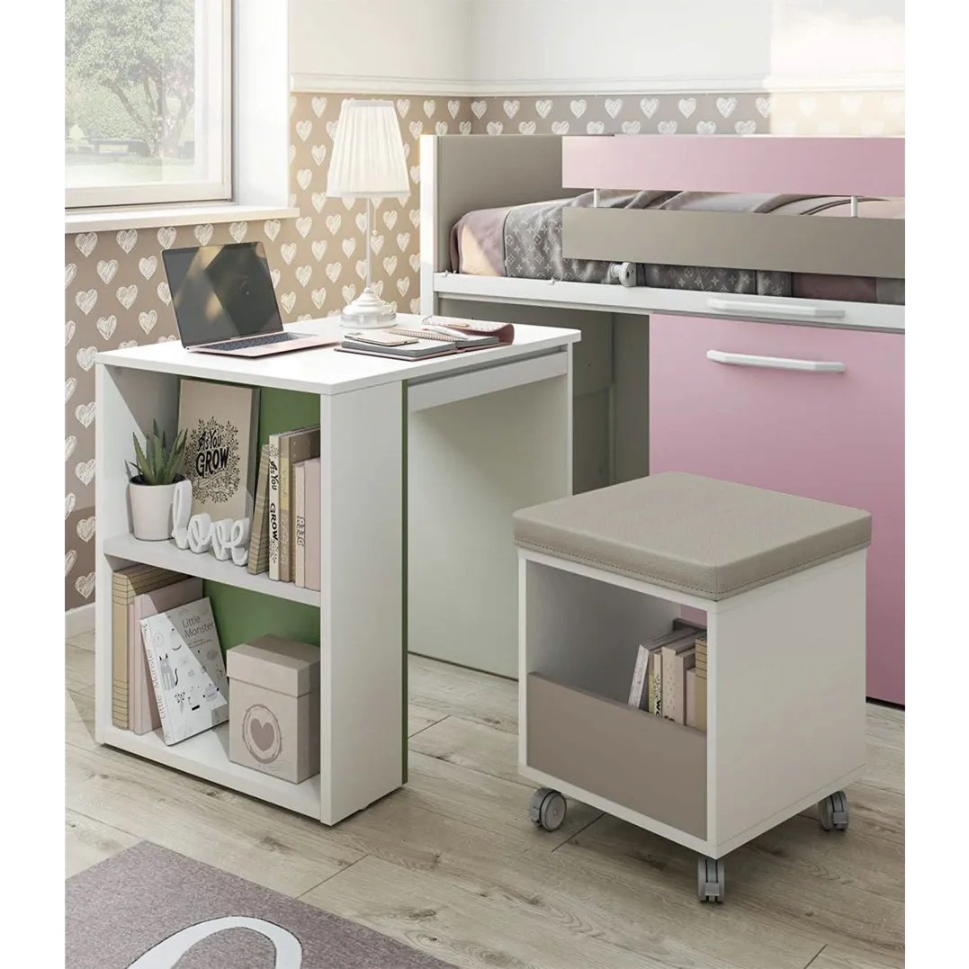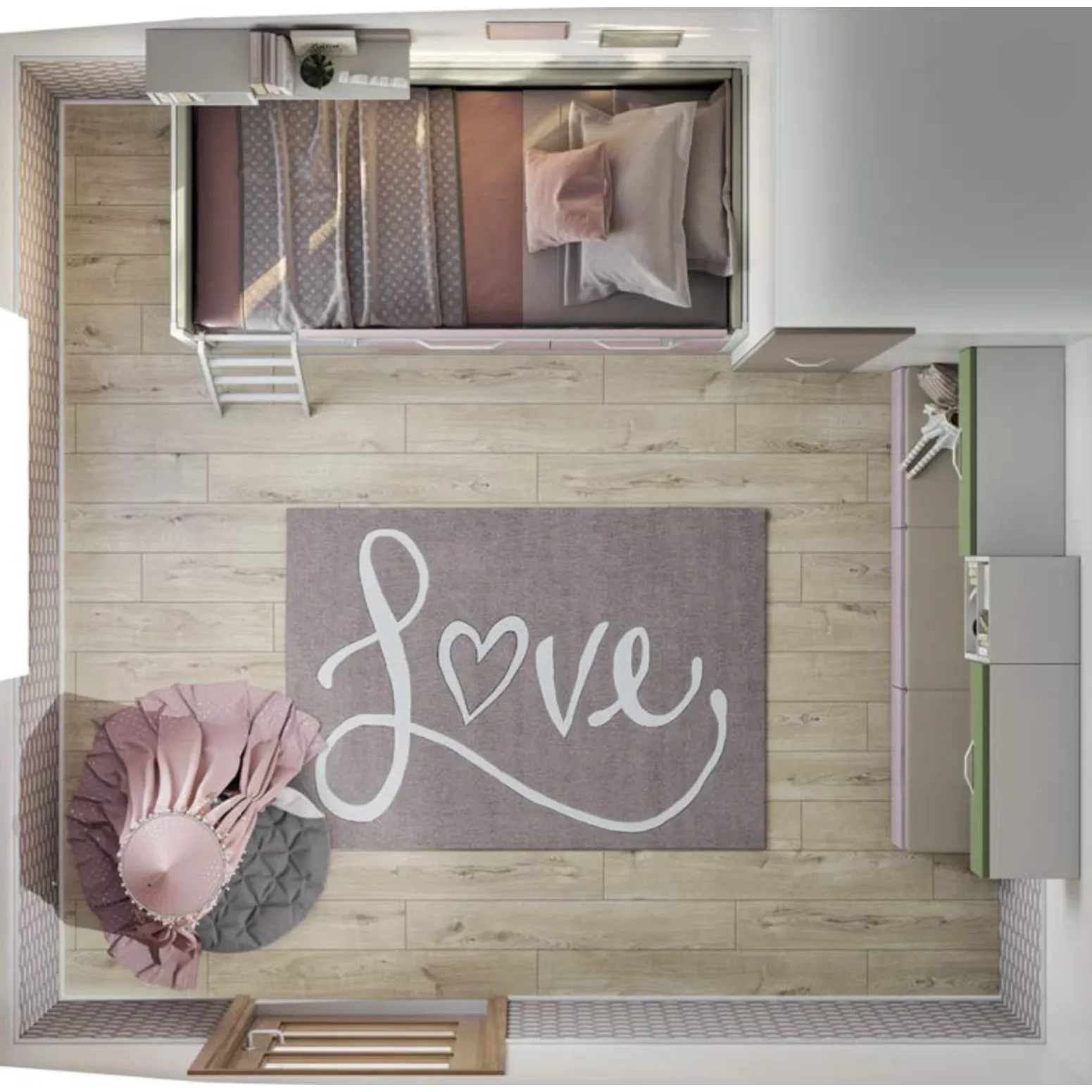 La struttura prevede un comodo e sicuro posto letto dotato di scaletta in alluminio e protezione, 2 cestoni estraibili con tubi appendiabiti ed una pratica scrivania estraibile a cui è possibile aggiungere il pouf con ruote.