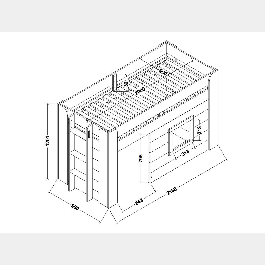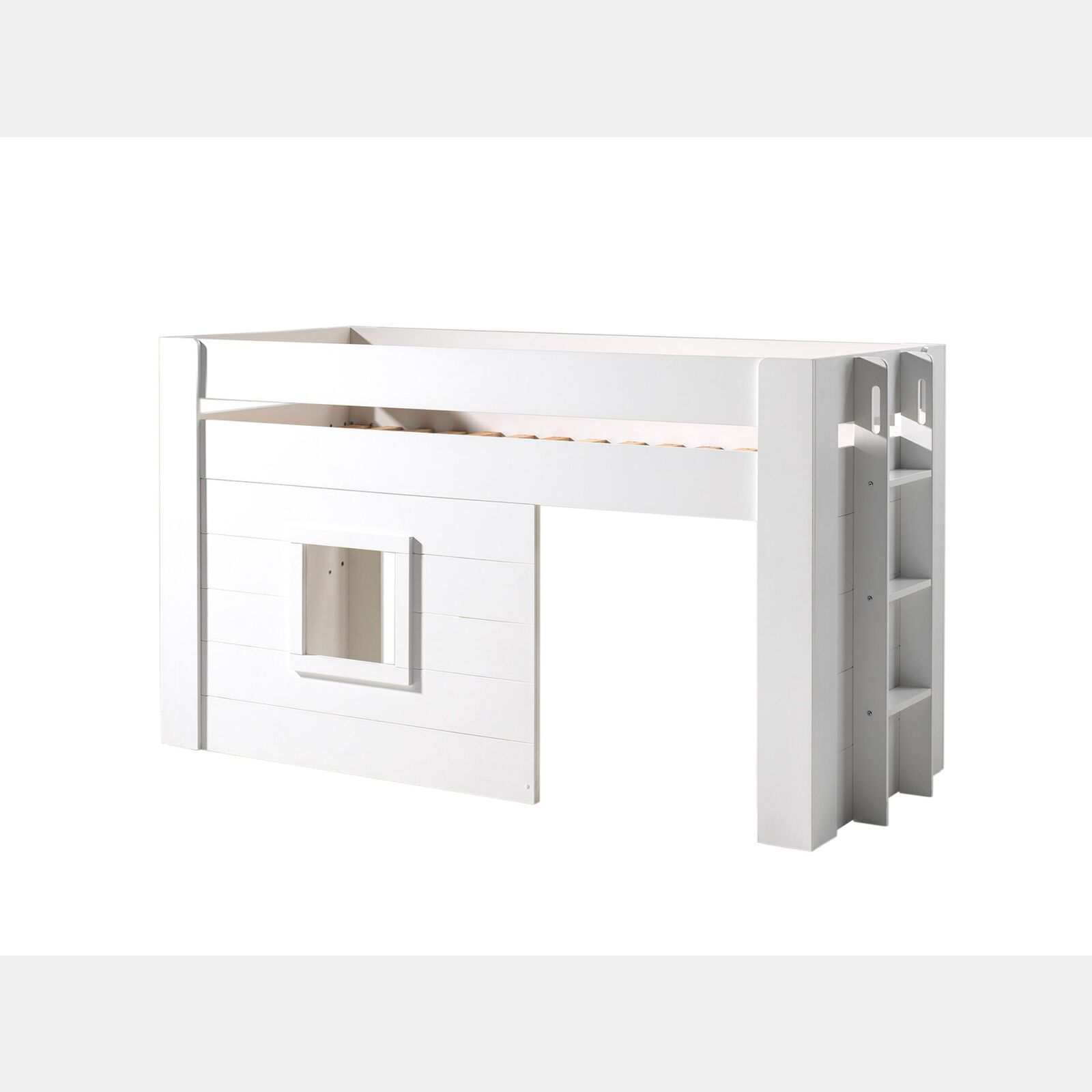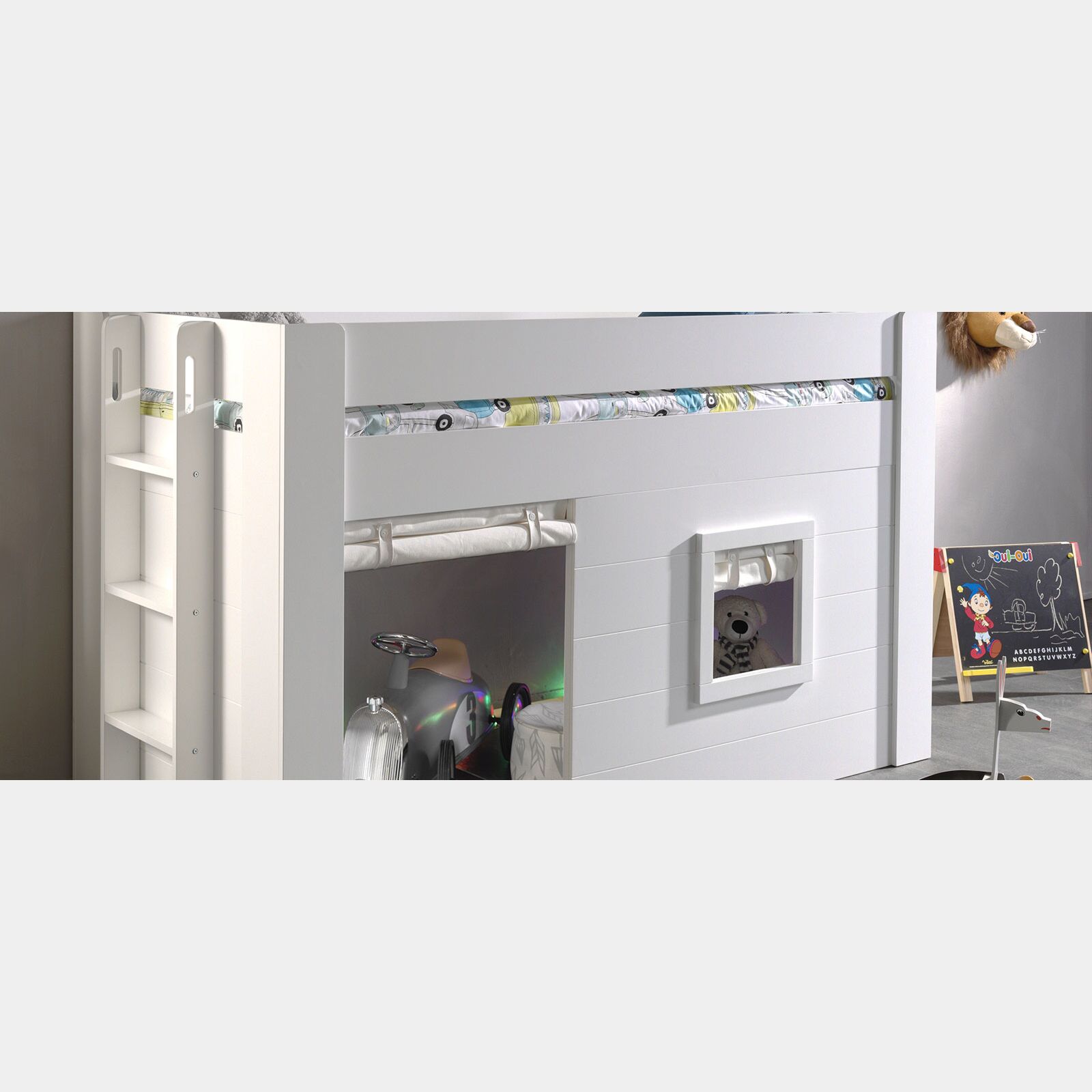 Il letto è rifinito in laccato bianco e viene fornito con una rete a doghe inclusa (90x200). Il letto ha le sponde alte per dormire in tutta sicurezza. La parte inferiore ricorda una casa ed è il luogo perfetto per ore di divertimento e gioco! È possibile aggiungere ancora più dettagli a questa casetta con un set tessile opzionale che contiene tende e una porta in tessuto bianco.