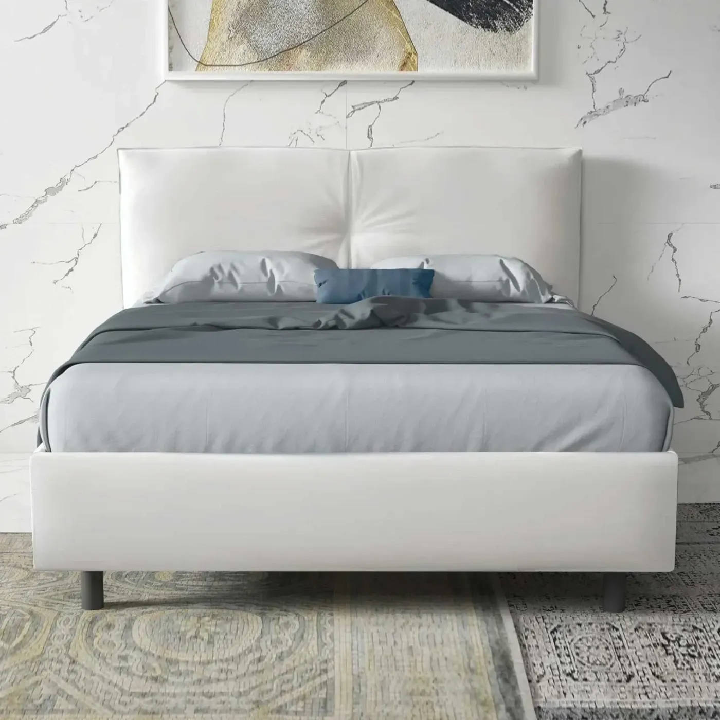 Letto matrimoniale Bianco Ecopelle. E’ disponibile anche in versione Verde Salvia, Azzurro, Tortora, Ecopelle Bianco, Fumo, Ghiaccio.