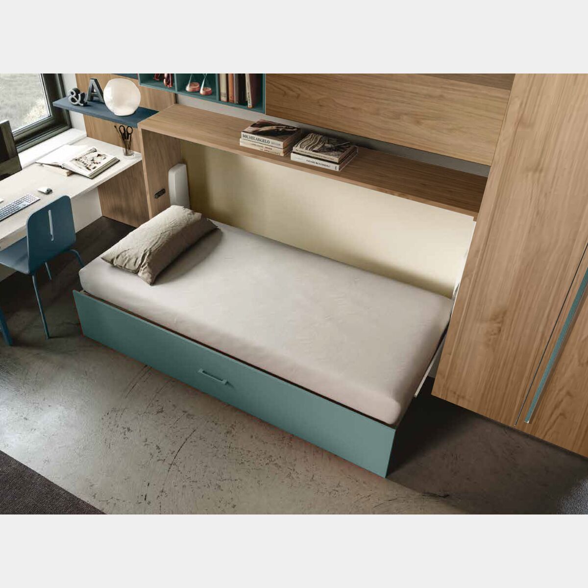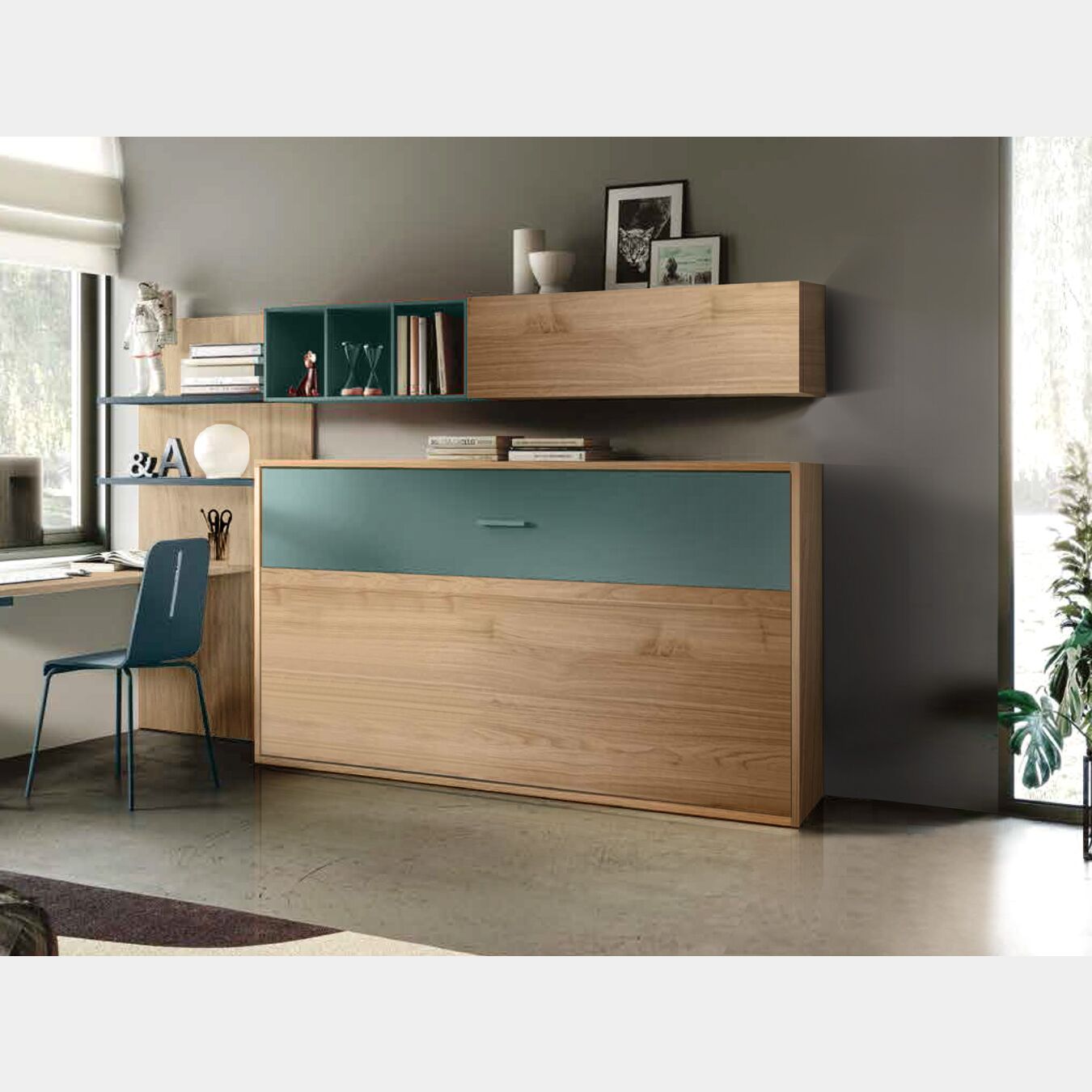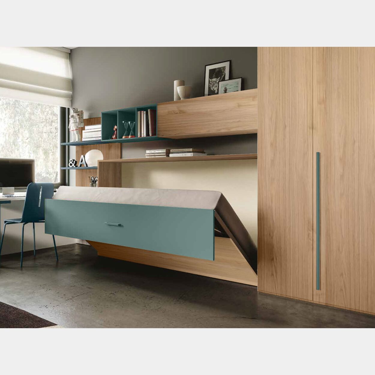 Letto trasformabile una piazza e mezza Noce biondo e Verde salvia a scomparsa, orizzontale