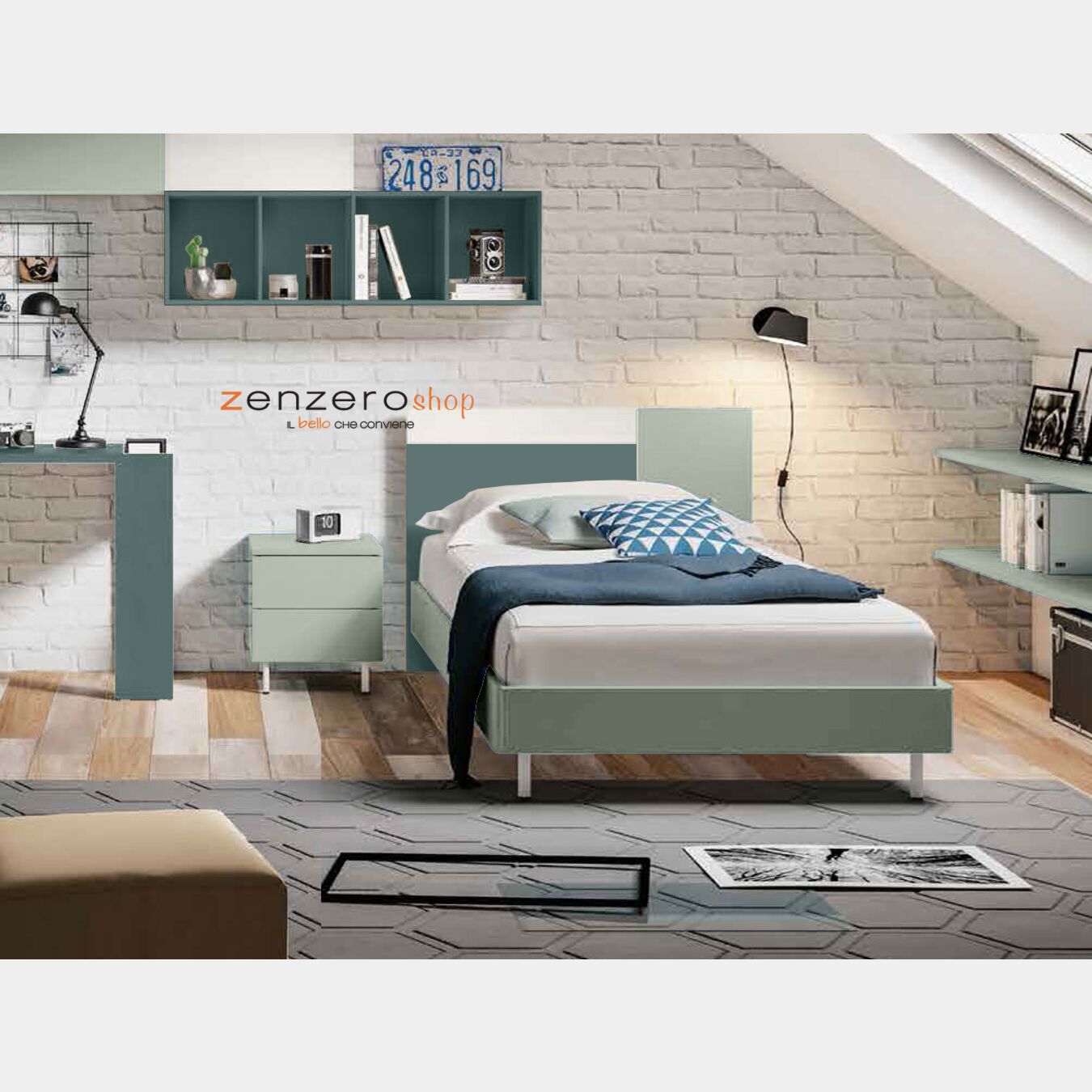 Moderno e di design il letto POP è disponibile nelle finiture Essenze e Colorati e i vari componenti possono essere scelti di diversi colori. La finitura del letto in questo caso sono 3, Verde Salvia, Orzo e Agave. E' possibile aggiungere come optional una rete a doghe e anche tutti gli altri elementi presenti nella camera come: Comodino 2 cassetti (fornito montato) con guide quadro ammortizzate, scrivania con porta riviste e fissaggio al muro, sedia, Libreria e pensile a muro e set mensole.