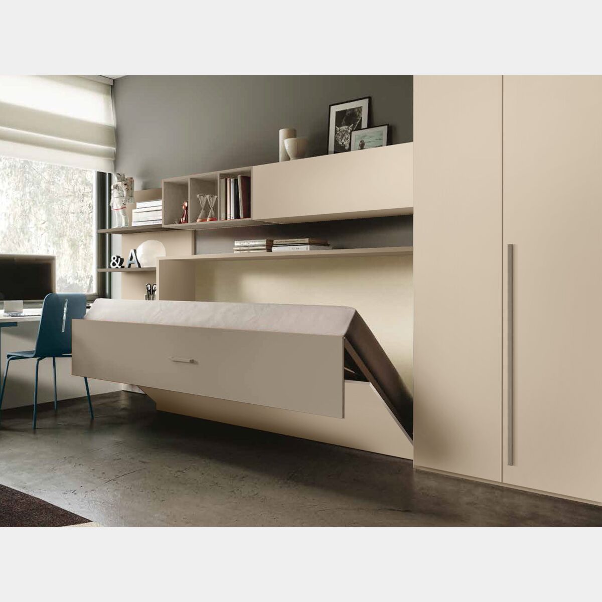 Il modello proposto è un letto a parete orizzonatale con apertura battente: un mobile letto che da chiuso ha un ingombro di soli 40 centimetri, ma una volta aperto diventa a tutti gli effetti un comodo letto una piazza e mezza.