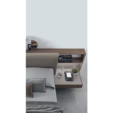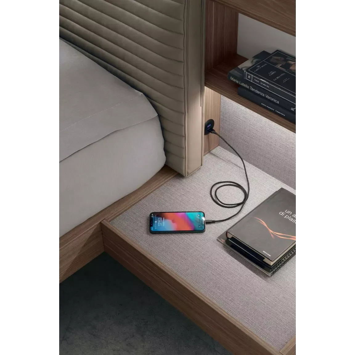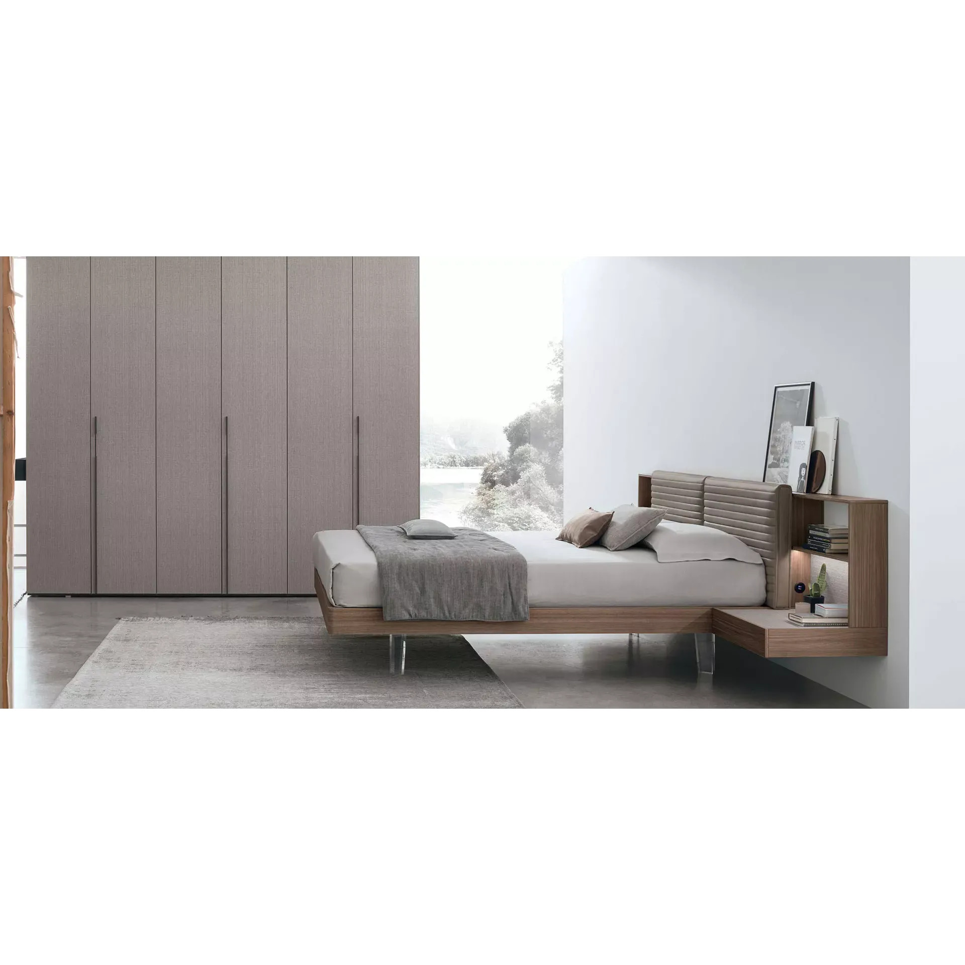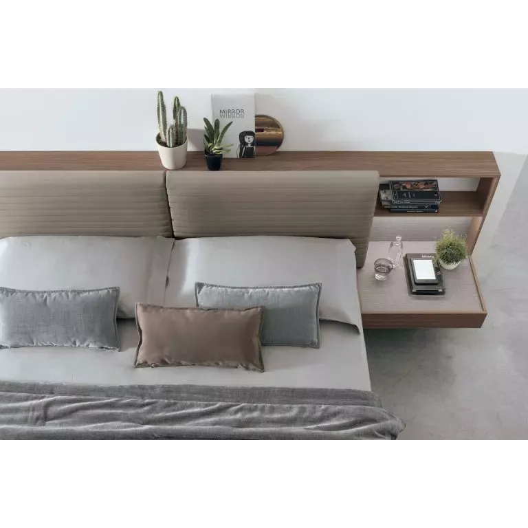 Le tinte a contrasto Noce ambra e Alpaca creano un gioco cromatico che enfatizza le linee moderne del letto.