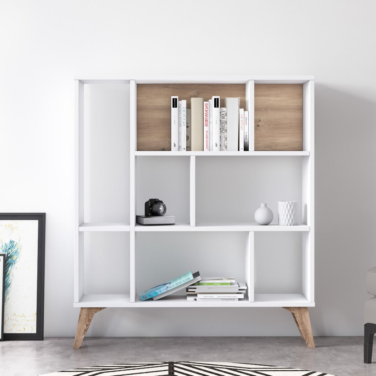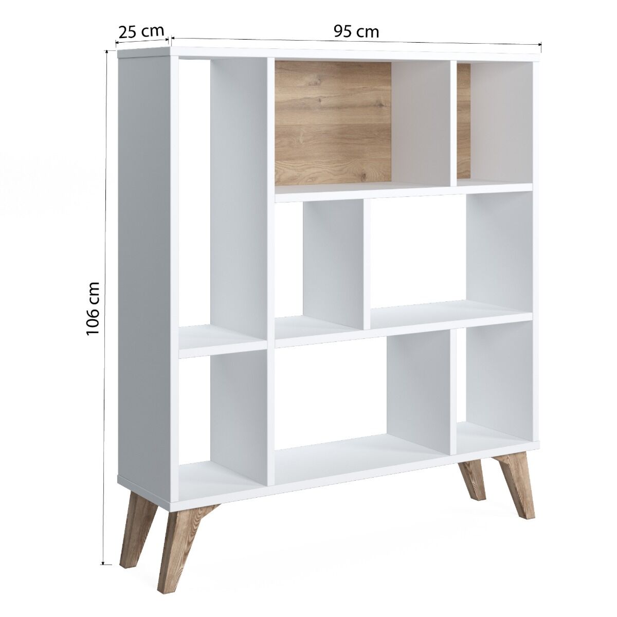 La libreria presenta una struttura bianca composta da diversi ripiani e divisori che creano 8 vani a giorno, di differenti dimensioni. Nella parte superiore della libreria si trova un pannello in Rovere, che richiama i piedini.