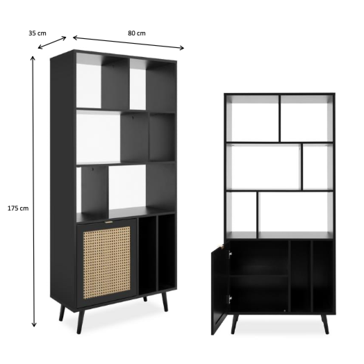 La libreria è dotata di un'anta nella parte inferiore con un ripiano centrale e diverdi divisiori che creano vani a giorno di differenti dimensioni.