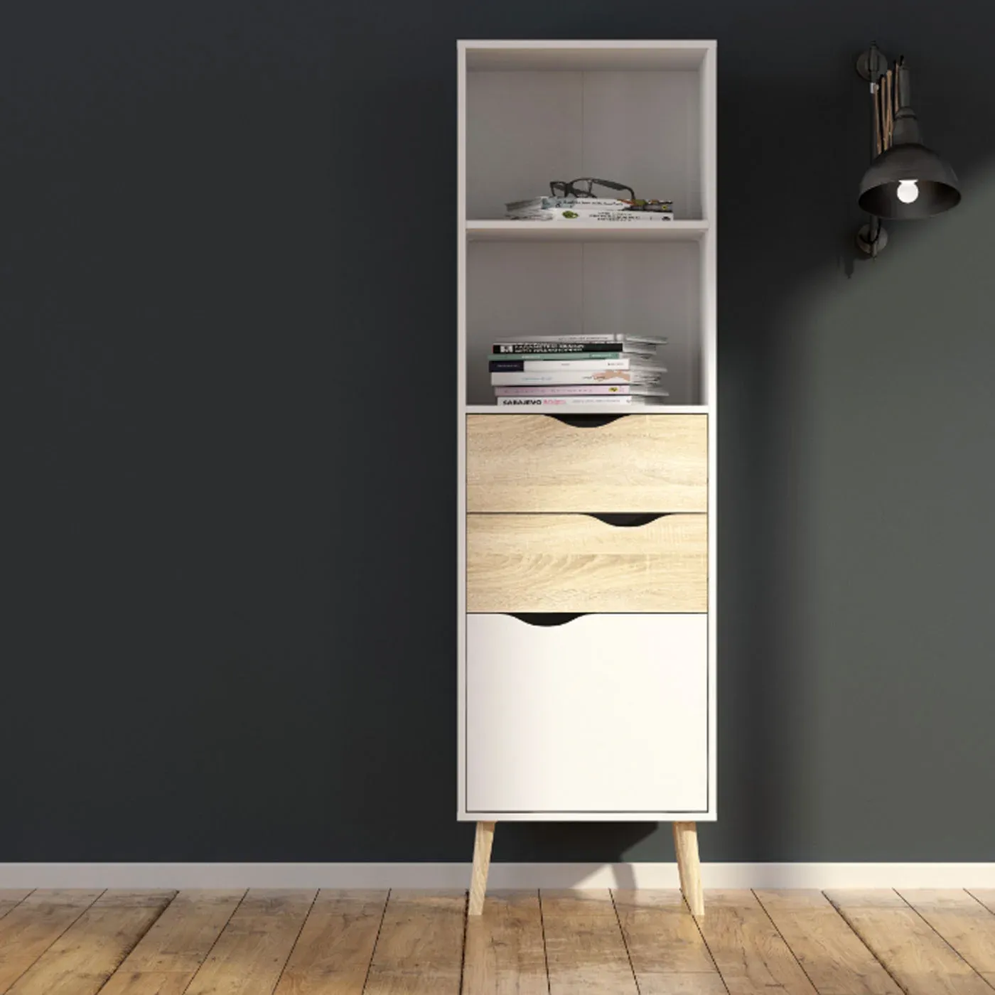 Elegante libreria di colore Bianco e Rovere. La libreria è semplice ma ben organizzata per riporre i propri documenti. La libreria è molto capiente grazie ai due cassetti, ai due vani a giorno e nella parte inferiore i ripiani con l'anta. La libreria è spaziosa se si vuole inserire i documenti in ordine.