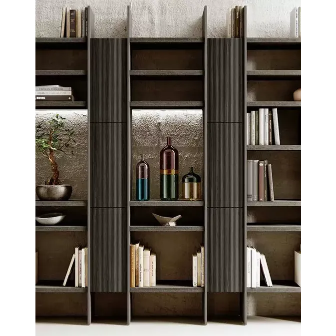 Vengono alternati quattro moduli con ripiani a tre pensili verticali con anta battente, dotati di ripiano centrale, questa composizione risulta un ottimo compromesso tra estetica e praticità, che assicura un'ampia capienza per libri, documenti e oggetti d'arredo che personalizzano l'ambiente.