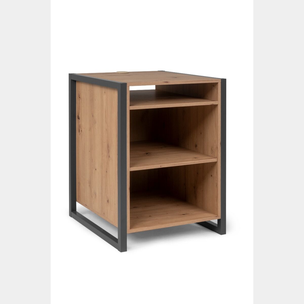 E' composta da un ripiano centrale e un ripiano in alto che crea un piccolo vano. La struttura è in finitura antracite mentre i ripiani sono in rovere nodato.