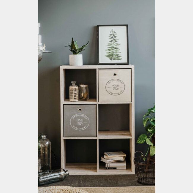 Mobile da ingresso composto da 6 vani a giorno posti in stile libreria, rendendolo adatto all'arredo di un soggiorno moderno o di un ufficio, ma molto versatile e può essere posizionata in più zone della casa. Offre la possibilità di contenere diversi complementi d'arredo ed oggettistica varia di decorazione. E' possibile aggiungere come optional uno più contenitori portaggetti in tessuto come in foto