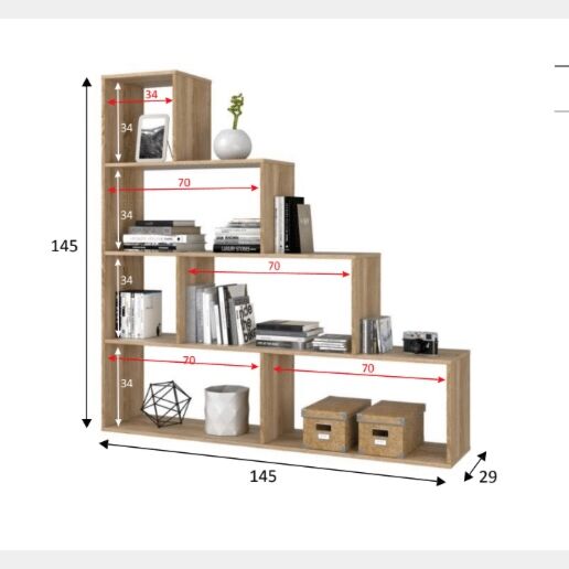 La libreria presenta un particolare design a scala, risultando così una perfetta soluzione capace di coniugare estetica a praticità. L'ampia capienza offre la possibilità di personalizzare il living inserendo oggetti personali come souvenier, collezioni di libri e soprammobili vari.