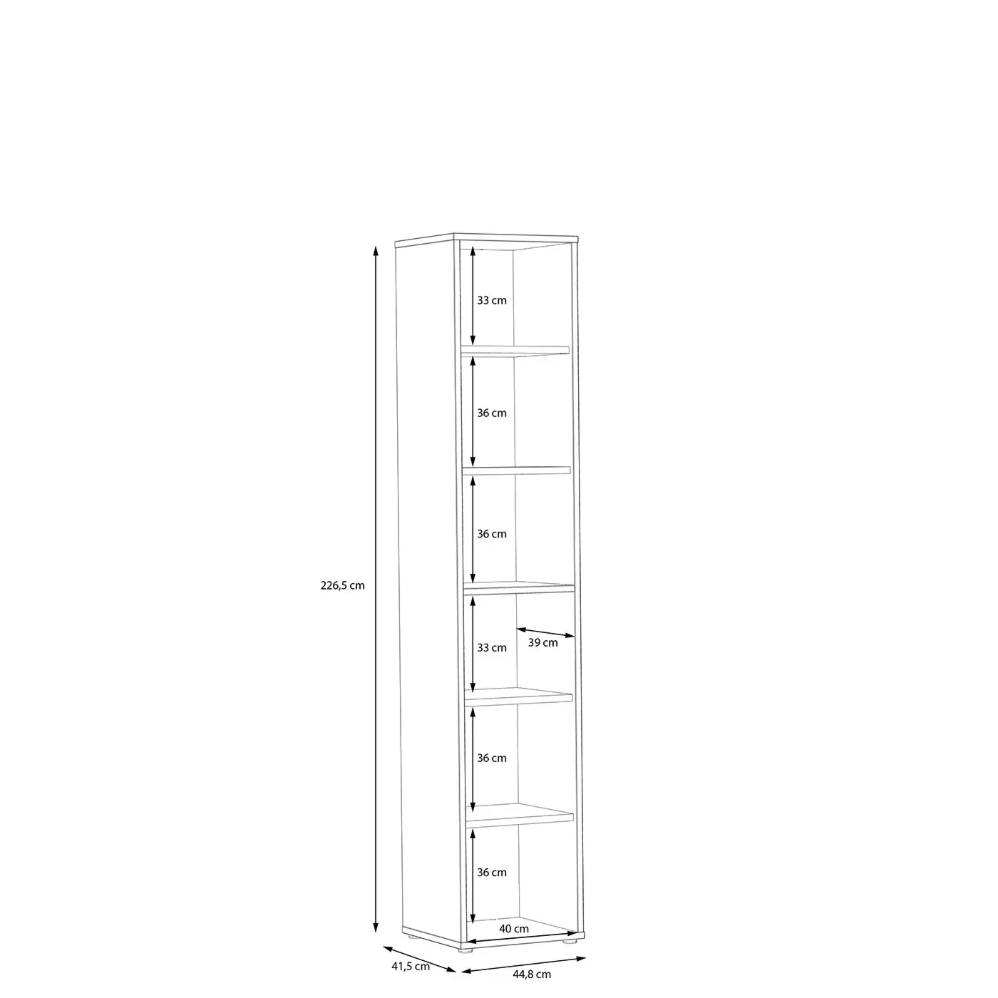 La libreria è composta da due parti, una prima colonna con cinque ripiani a vista e un'altra con due ante in vetro e due classiche, entrambe con chiusura ammortizzata.