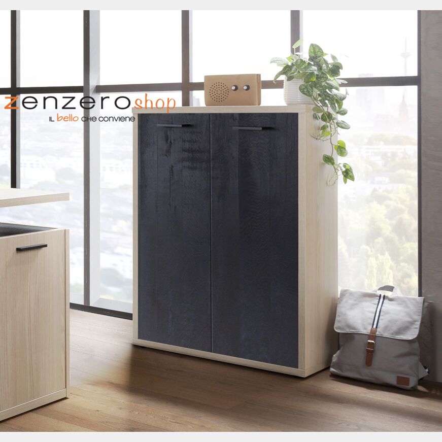 La delicata finitura in Rovere rende l'ambiente calco e accogliente mentre il Nero chalet delle ante dona carattere e stile. Il suo design semplice e lineare offre un arredo moderno e di tendenza, è possibile abbinare la libreria ad altre con diverse dimensioni, a tavoli o scrivanie.
