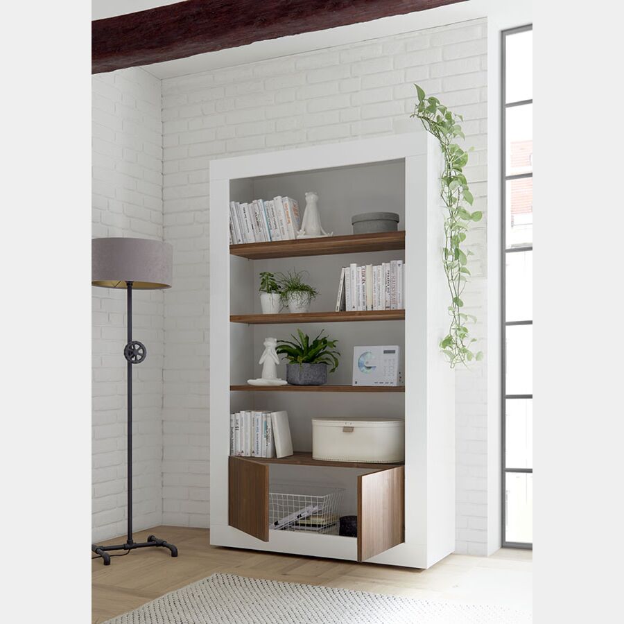Libreria moderna con 3 ripiani e 2 ante, finitura Bianca Lucida e Noce Dark