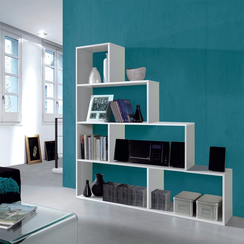 Libreria moderna, bassa, con 4 ripiani, colore bianco.Pratica soluzione per arredare qualsiasi stanza, come ad esempio un ufficio, un living o una zona di passaggio.
