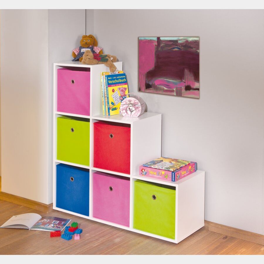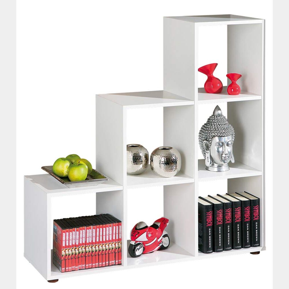 Libreria in laminato bianco con sei vani di forma quadrata.