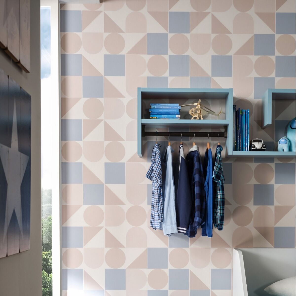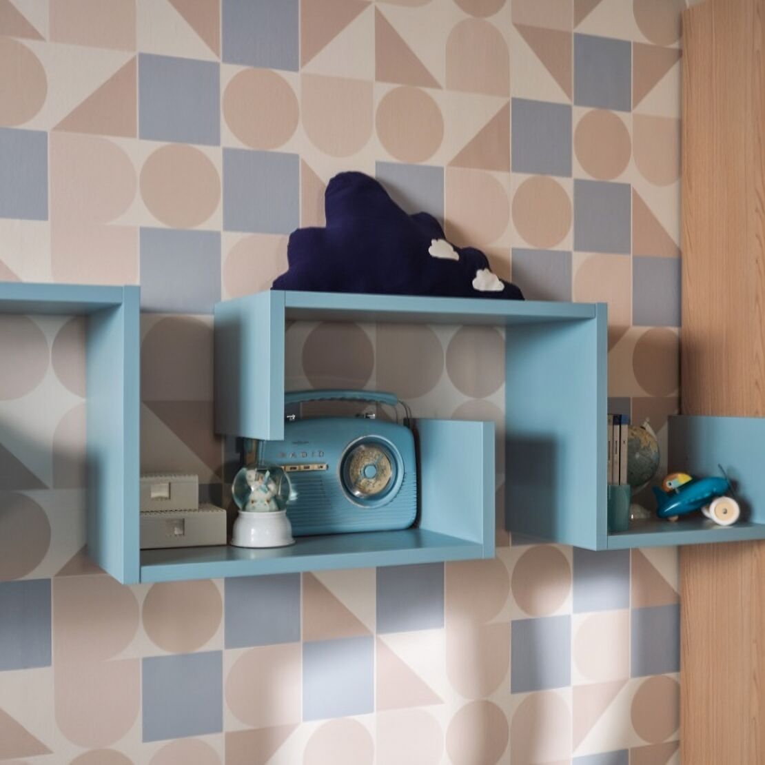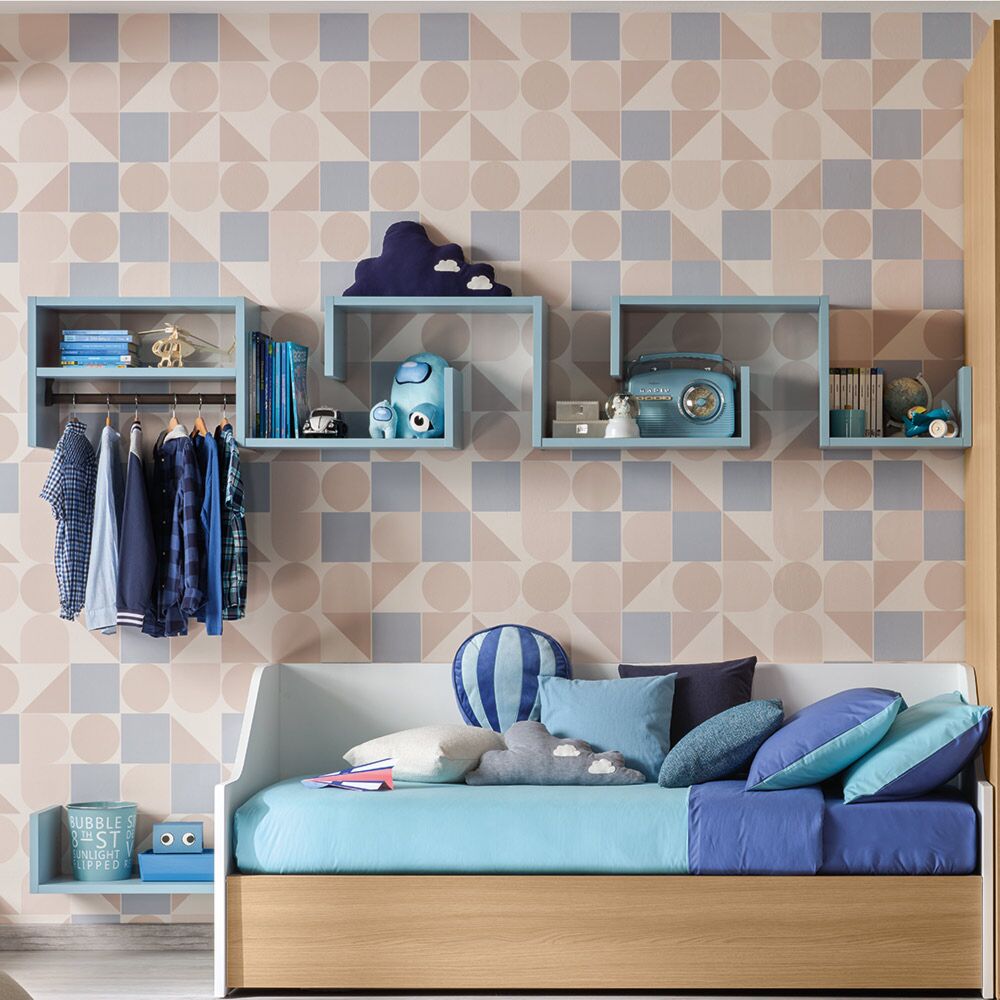 La linea fluida della libreria sospesa assicura alla cameretta del bambino uno stile originale e divertente, offrendo un ampio piano di appoggio per tutti i giochi, libri e complementi d'arredo che personalizzano l'ambiente.