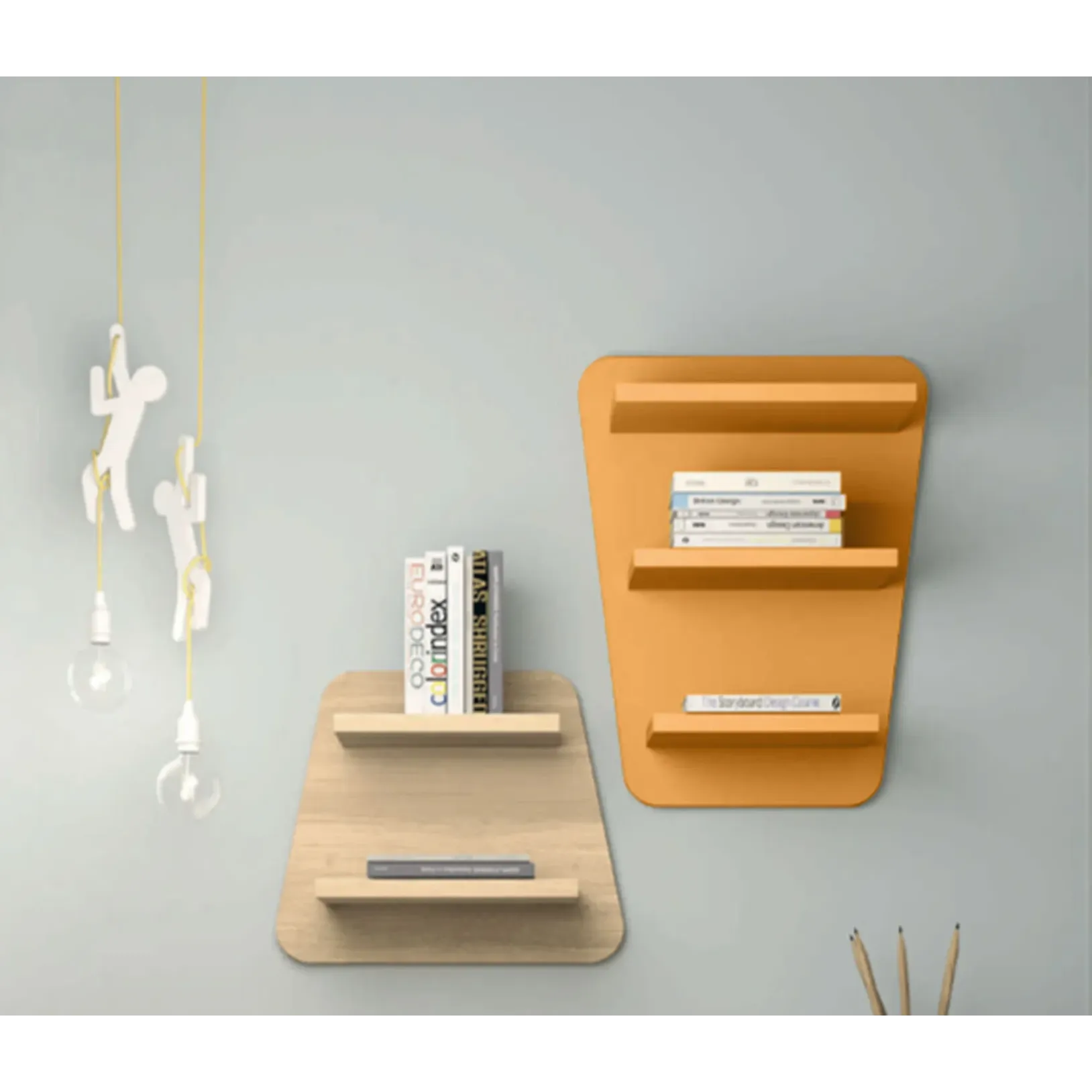 La composizione è formata da 2 pannelli attrezzati: uno con 2 ripiani in ciliegio nordico e l'altro con 3 ripiani in finitura giallo zafferano, un coordinamento stilistico che permette di giocare con le forme per rendere allegra e a misura di bambino ogni cameretta.
