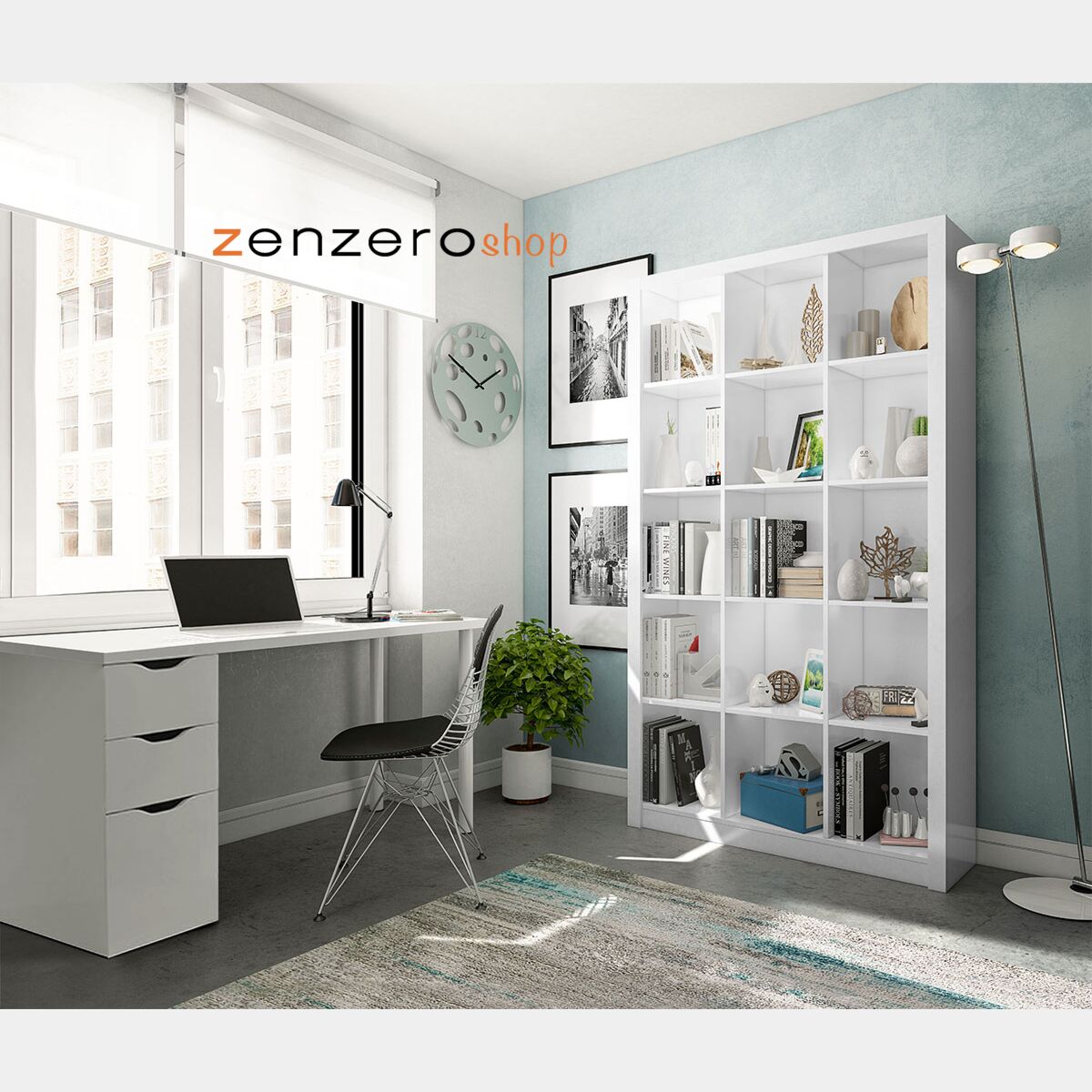Libreria Tripla con struttura e mensole in finitura bianco laccato lucido. La particolare struttura della libreria tripla, permette di avere fino a 15 piccoli ripiani su cui appoggiare le proprie cose.