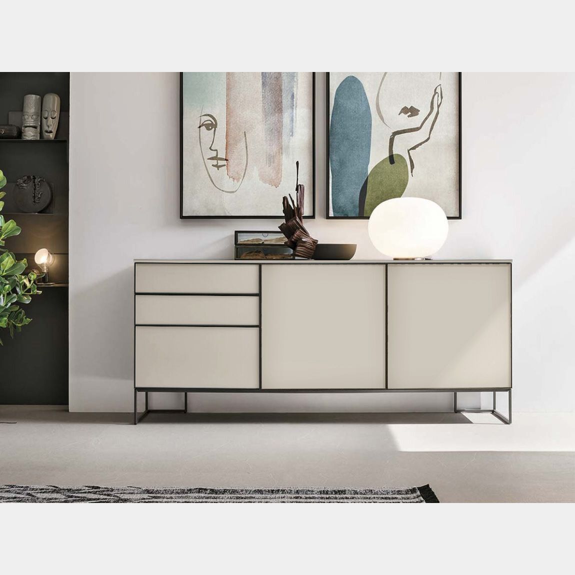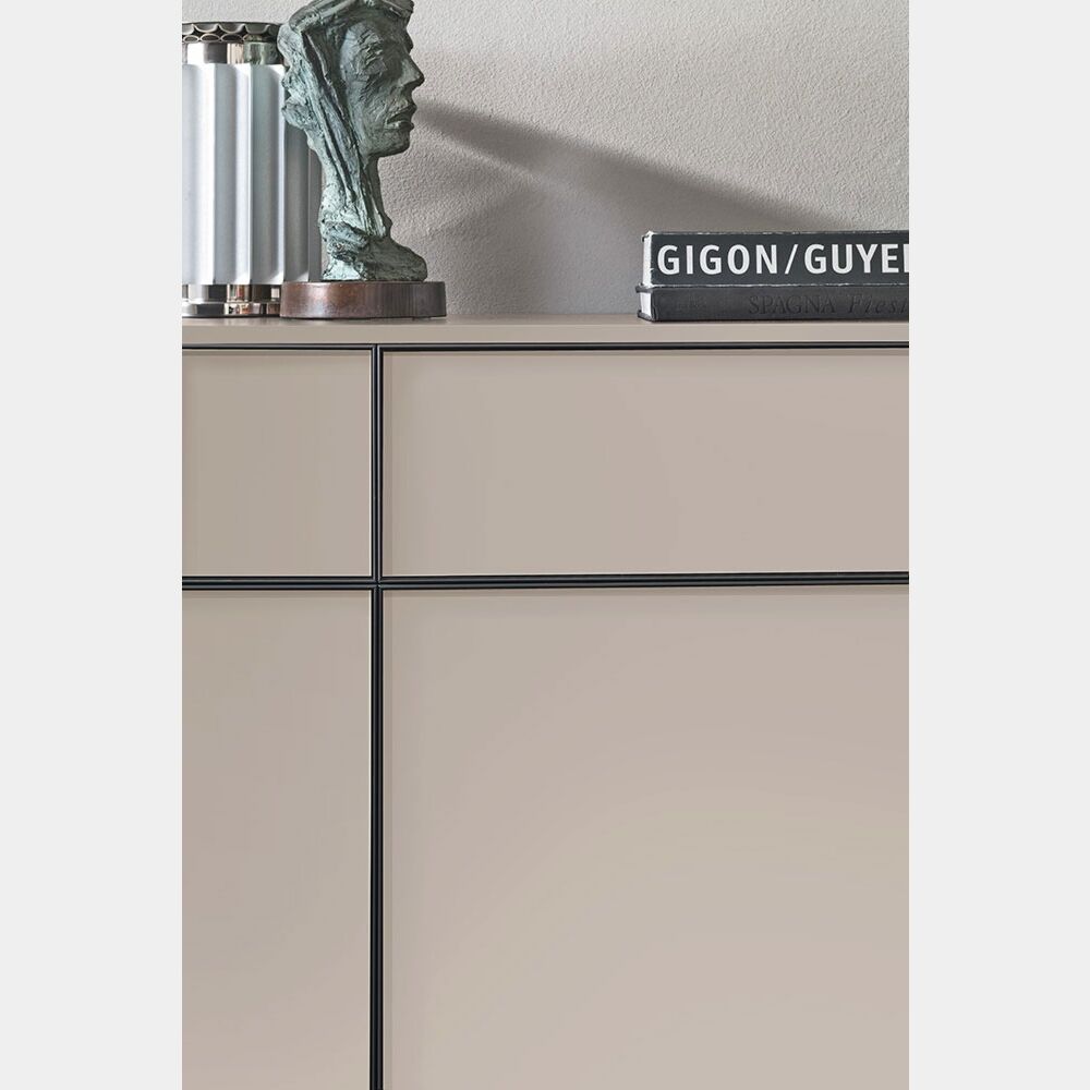 L'accostamento della lavorazione delle ante con il laccato Carta da zucchero di cassetti e cestone crea un'atmosfera elegante e moderna catturando l'attenzione; i profili in metallo incorniciano i singoli elementi evidenziandone l'estetica mentre i piedini industry completano la composizione.