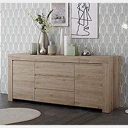 Questa madia 2 ante e 3 cassetti in finitura Rovere Samoa ha spessori da 18 mm, guide in metallo e apertura con presa a gola: tutto ciò che al momento è tendenza.