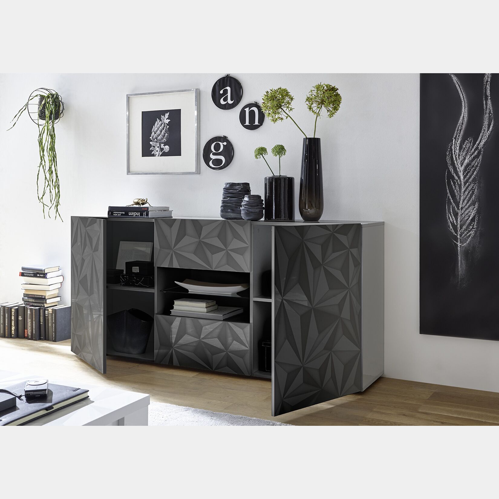 Madia 2 ante 2 cassetti in finitura grigio lucido con serigrafia prismatica. - Madia 2 ante 2 cassetti, moderna e di design. La madia è serigrafata con forme prismatiche e in finitura grigio lucido. La madia è composta da 2 cassetti centrali separati al centro da un vano a giorno con ripiano in vetro. Ai lati invece ci sono le 2 ante con un ripiano interno per ognuno.