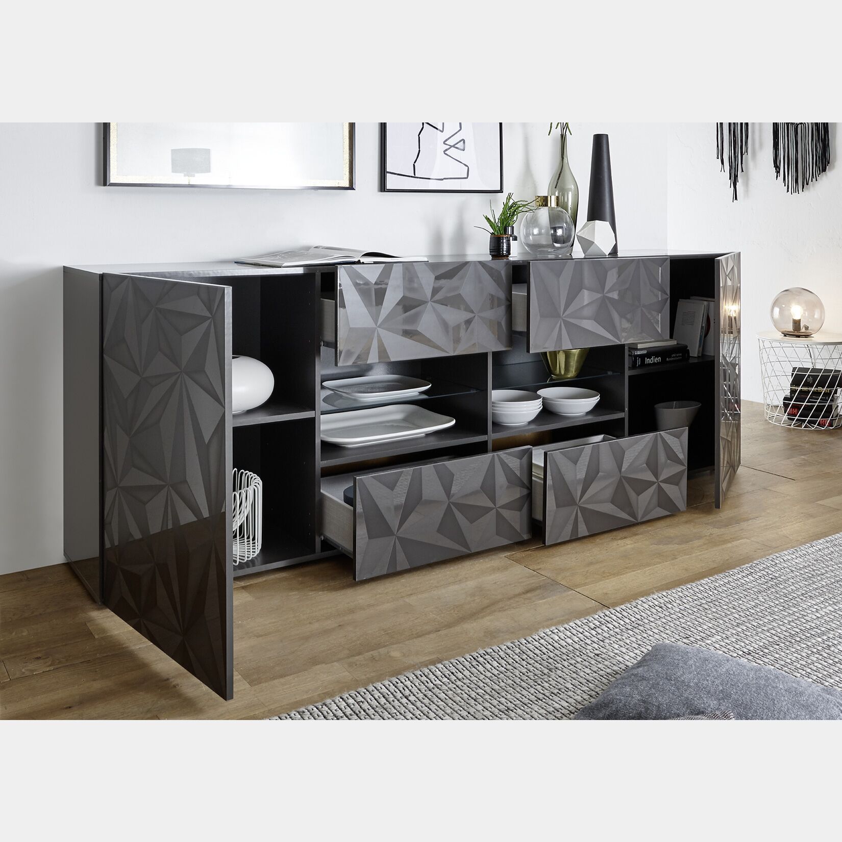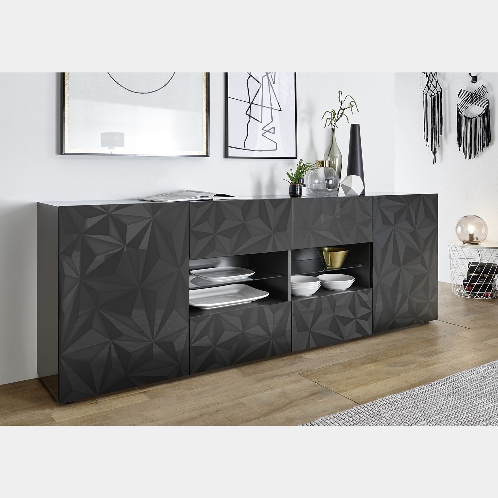 Madia 2 ante 4 cassetti in finitura grigio lucido con serigrafia prismatica. - Madia 2 ante 4 cassetti, moderna e di design. La madia è serigrafata con forme prismatiche e in finitura grigio lucido. La madia è composta da 4 cassetti centrali separati al centro da 2 vani a giorno con ripiani in vetro. Ai lati invece ci sono le 2 ante con un ripiano interno per ognuno.