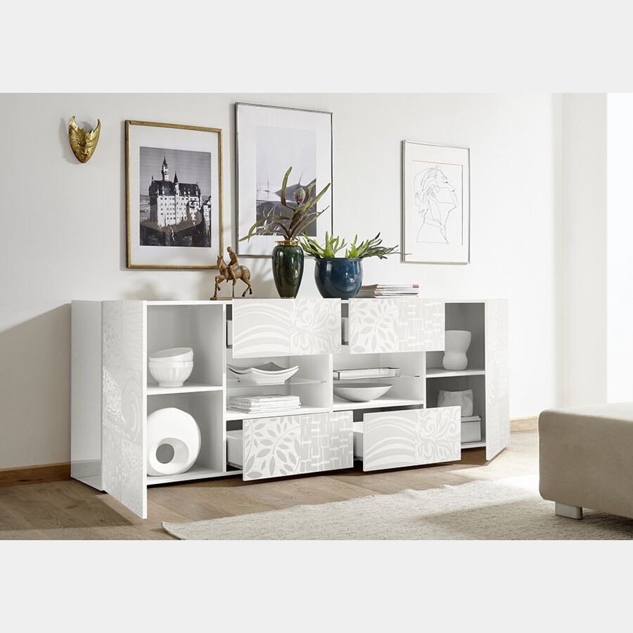 Madia 2 ante e 4 cassetti in bianco laccato lucido serigrafato