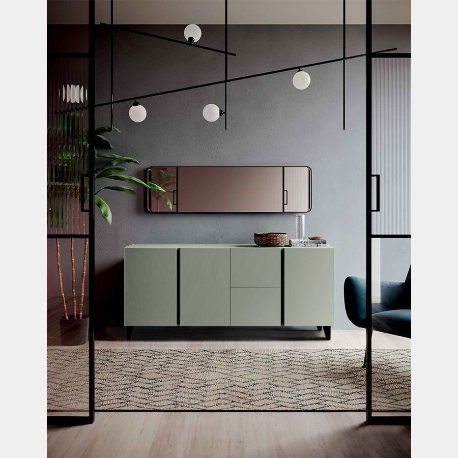 Le due gole facilitano l’apertura delle ante laterali, combinando praticità e design.La madia ha 3 ante e 2 cassetti con meccanismo di chiusura a molla di richiamo e ammortizzatore. Gli spessori delle ante e struttura variano da 18 e 22 mm a 14-18-22-40 mm. La madia è disponibile in diverse finiture nobilitate e laccate. In questo caso la finitura è agave antigraffio. La madia viene fornita con piedini rasoterra neri.