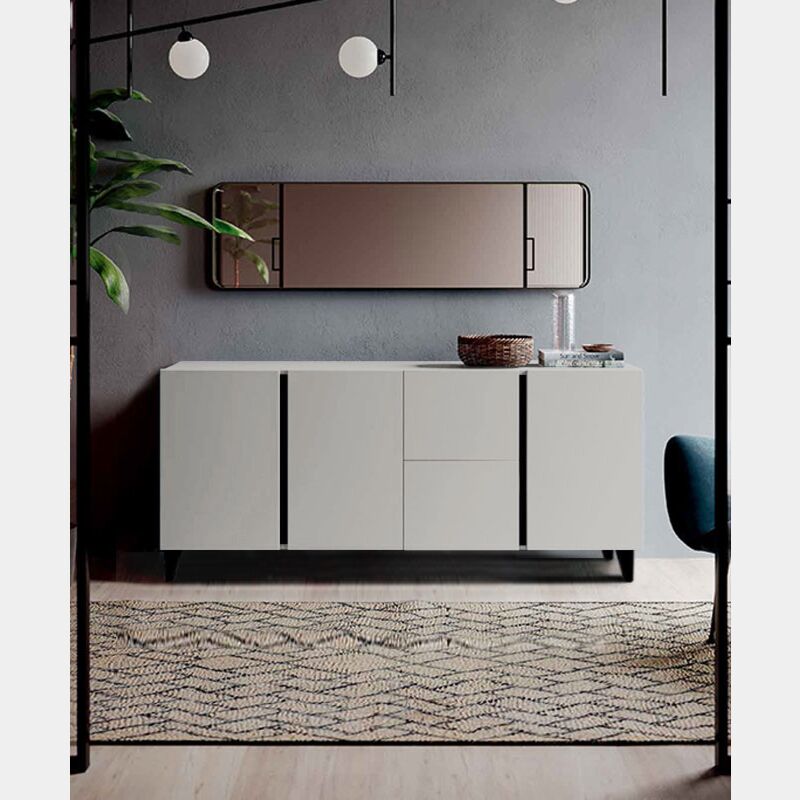 Le due gole facilitano l’apertura delle ante laterali, combinando praticità e design.La madia ha 3 ante e 2 cassetti con meccanismo di chiusura a molla di richiamo e ammortizzatore. Gli spessori delle ante e struttura variano da 18 e 22 mm a 14 - 18 - 22 - 40 mm. La madia è disponibile in diverse finiture nobilitate e laccate. In questo caso la finitura è grigio seta antigraffio. La madia viene fornita con piedini rasoterra neri.