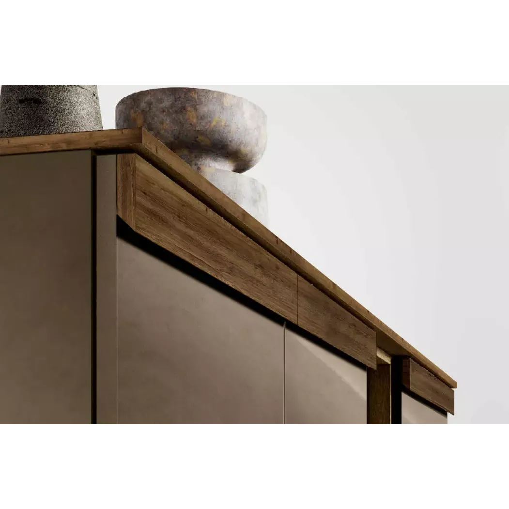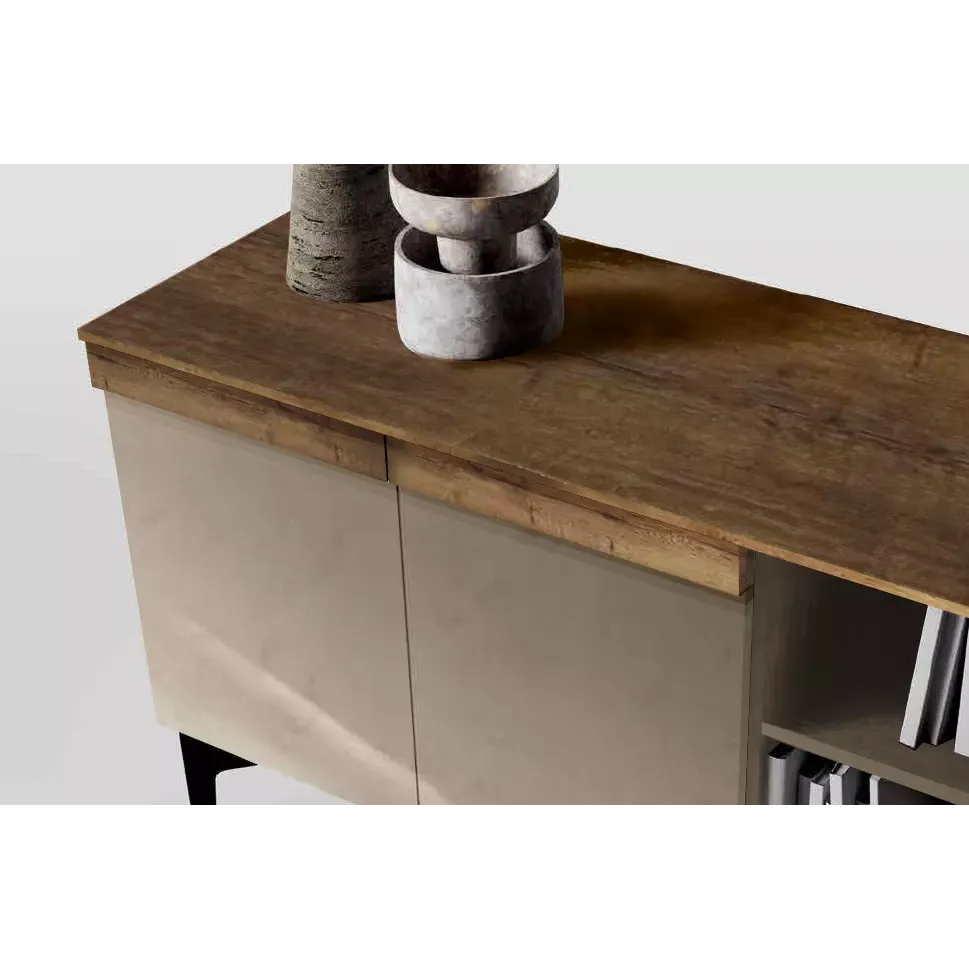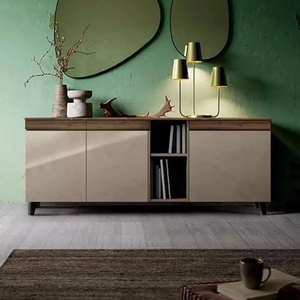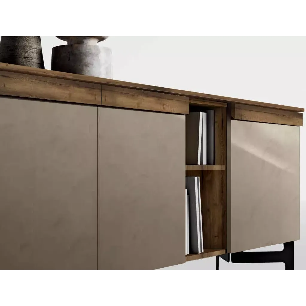E' composta da 3 ante in finitura Argilla, al loro interno è presente un ripiano centrale. Il vano a giorno presenta un ripiano centrale in finitura Rovere tabacco, l'ideale per posizionare soprammobili e metterli in vista. La madia viene fornita con i piedini a cono H.15 cm.