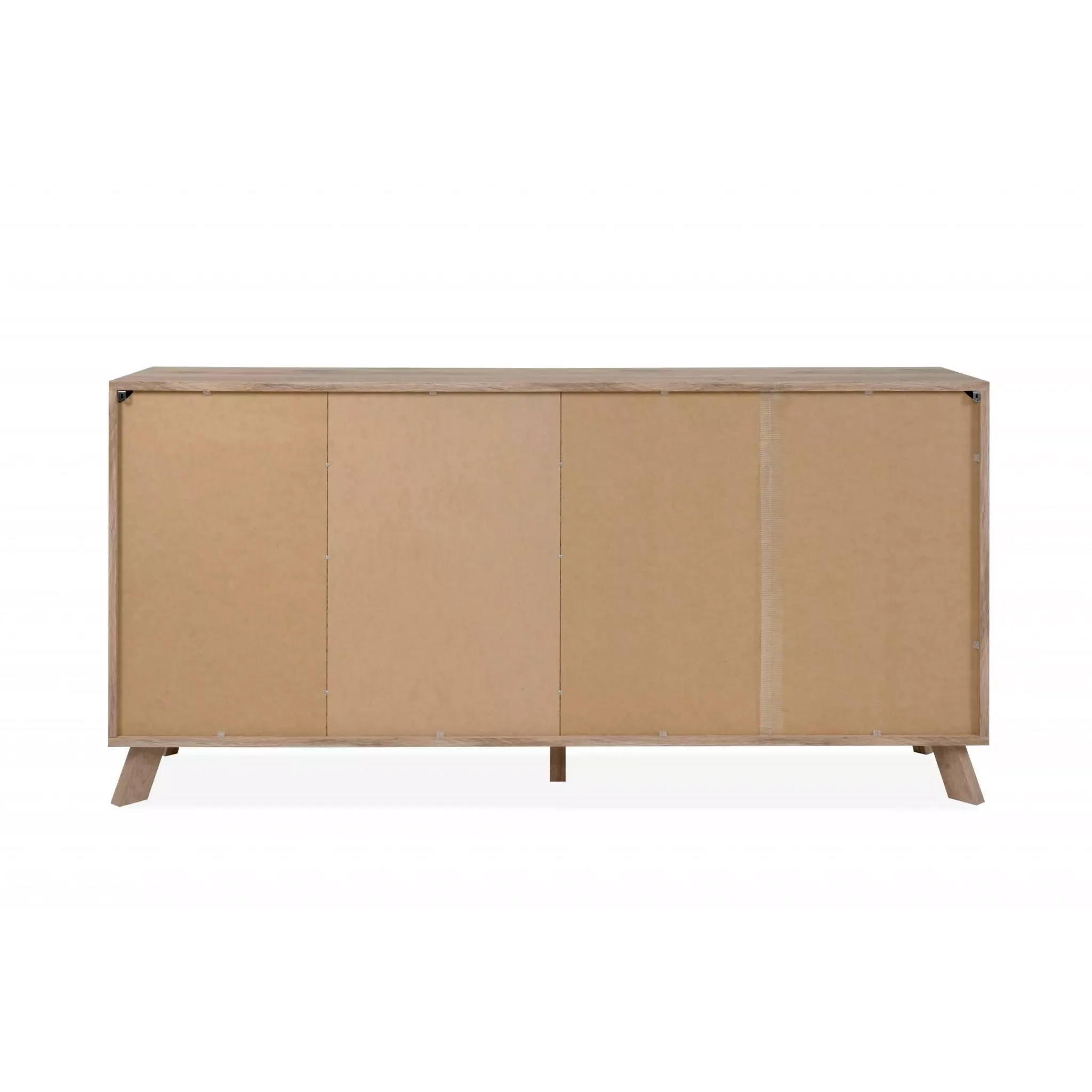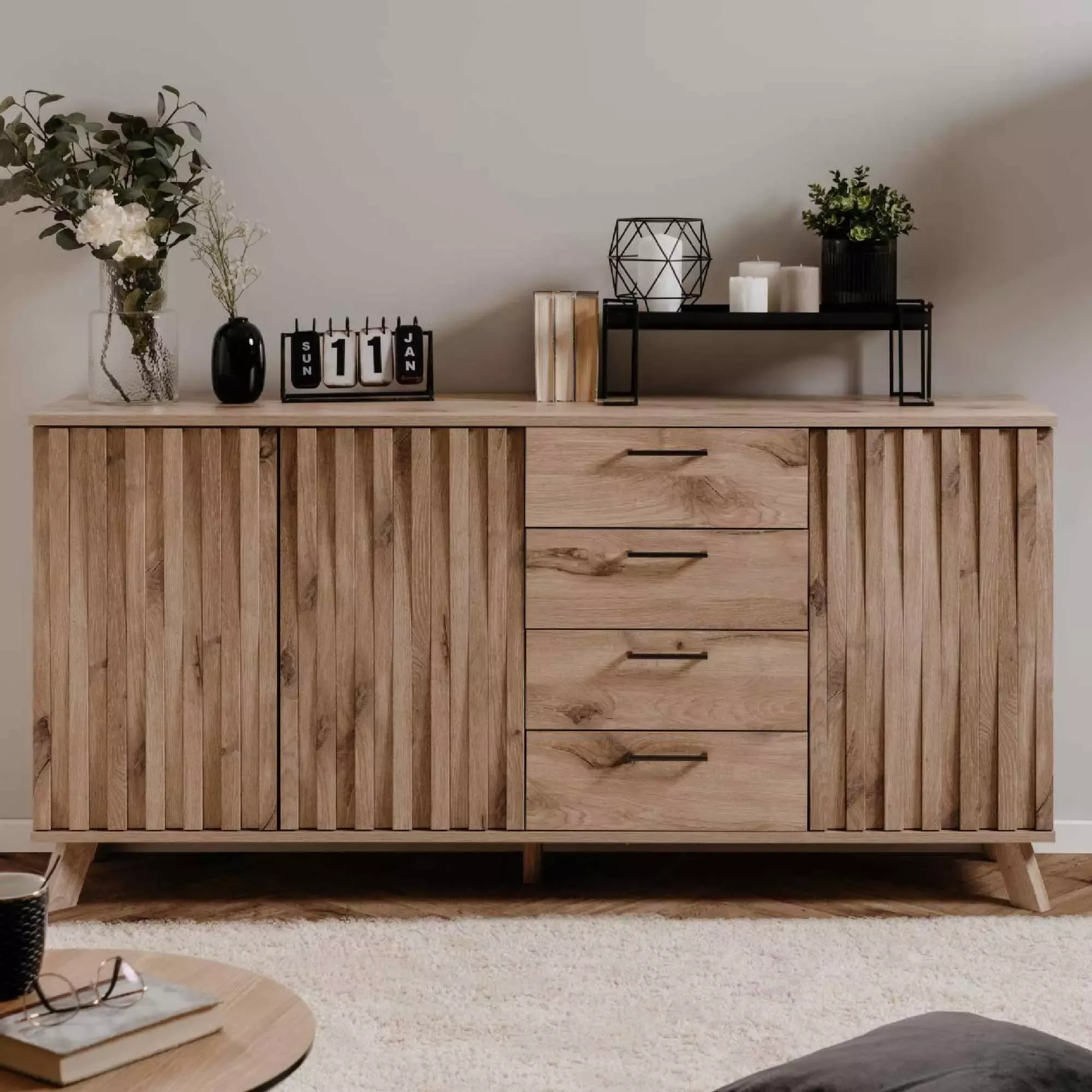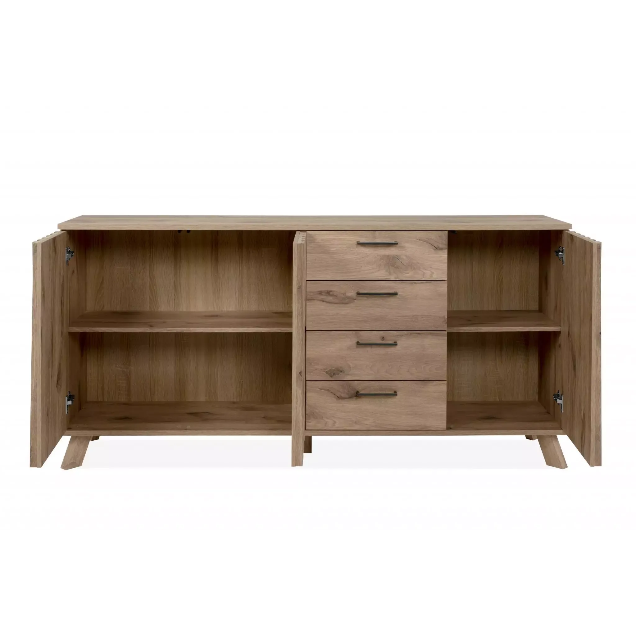 Credenza a tre ante e quattro cassetti con apertura battente colore Quercia del Nord.