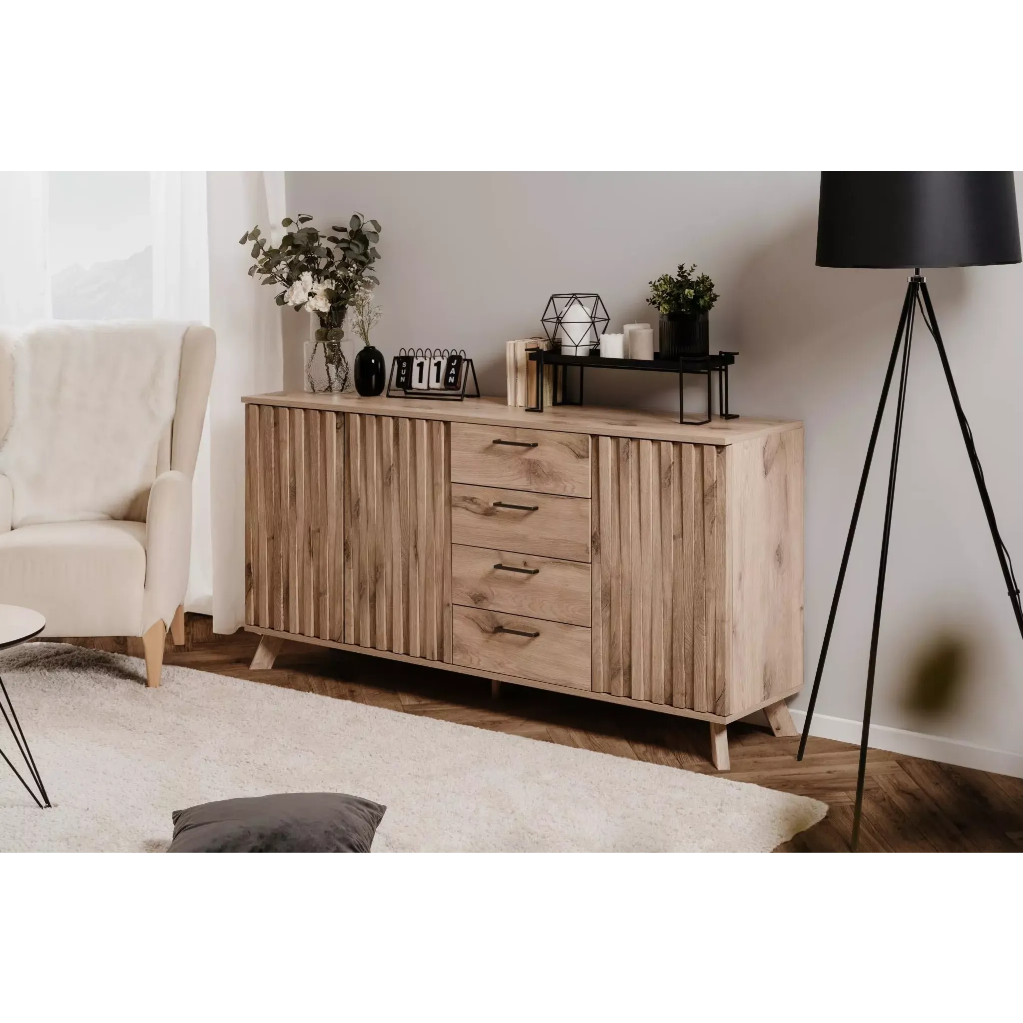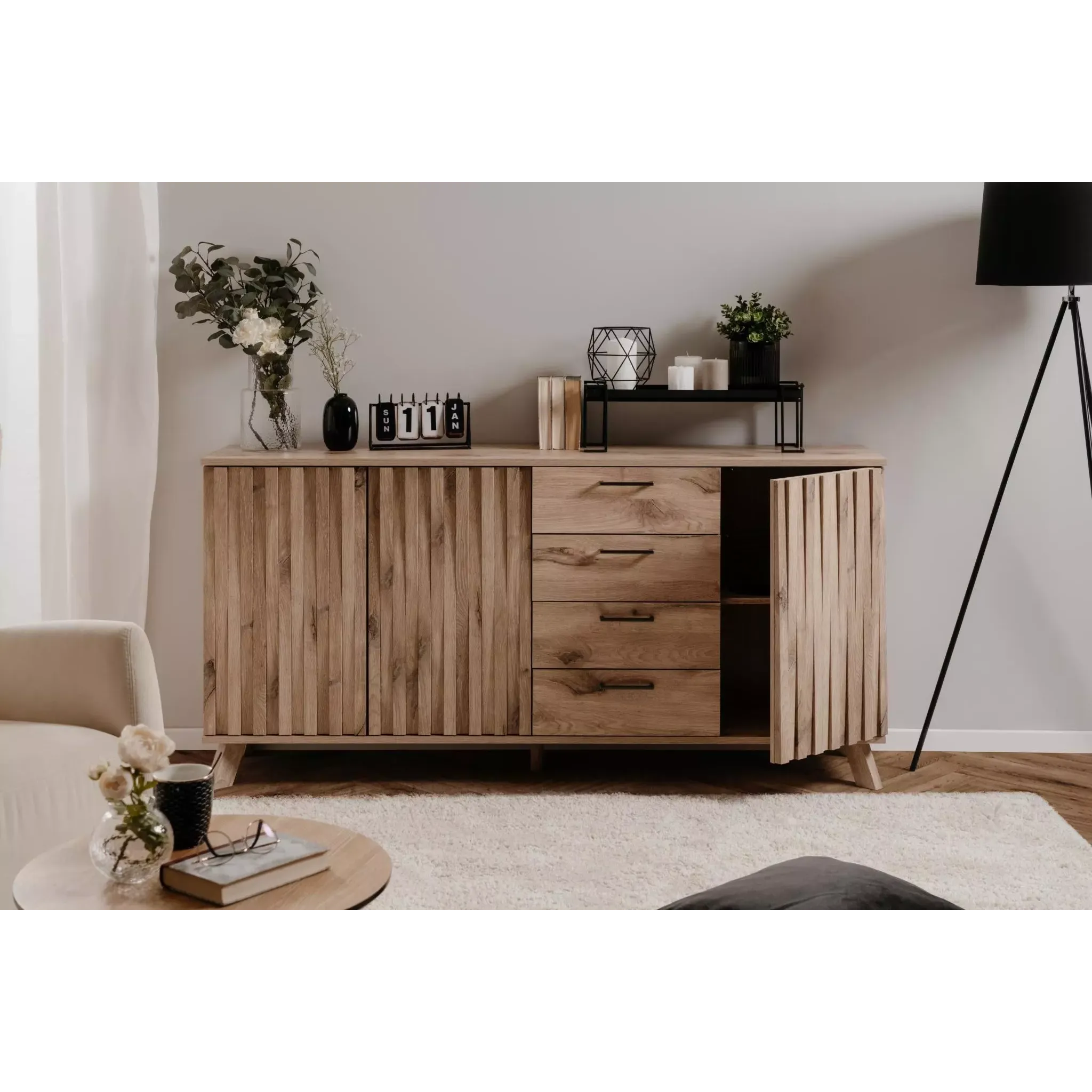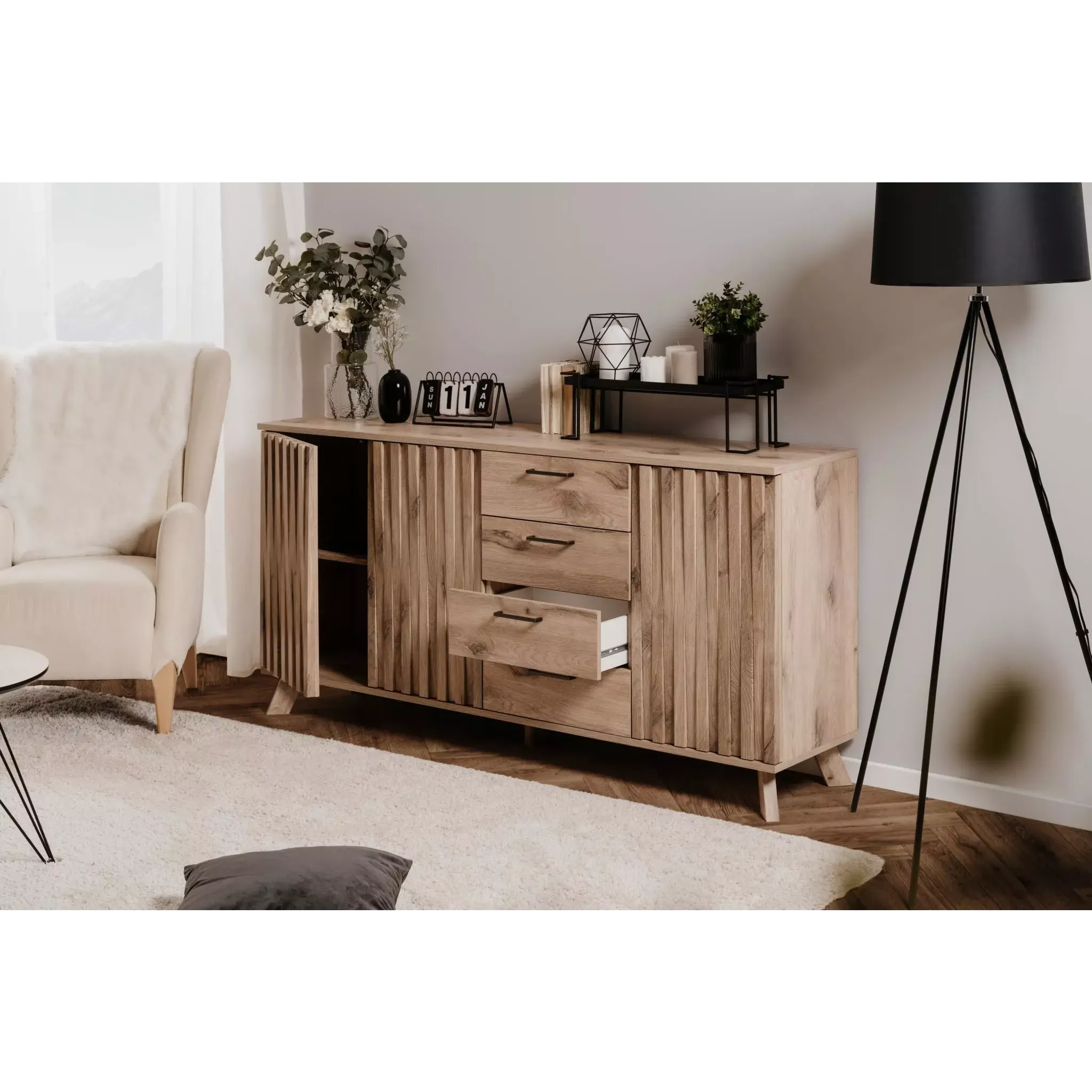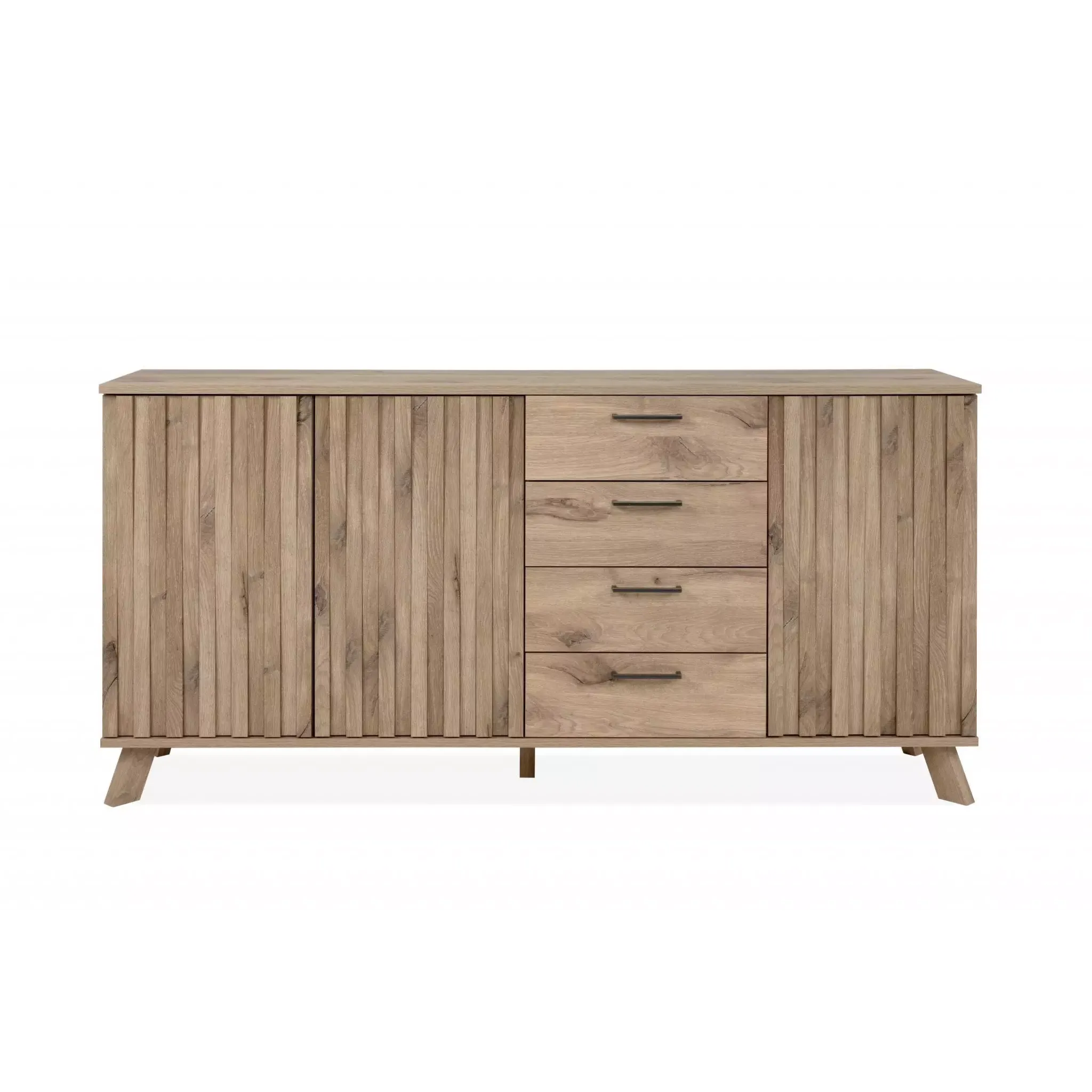 Credenza a tre ante e quattro cassetti con apertura battente colore Quercia del Nord.