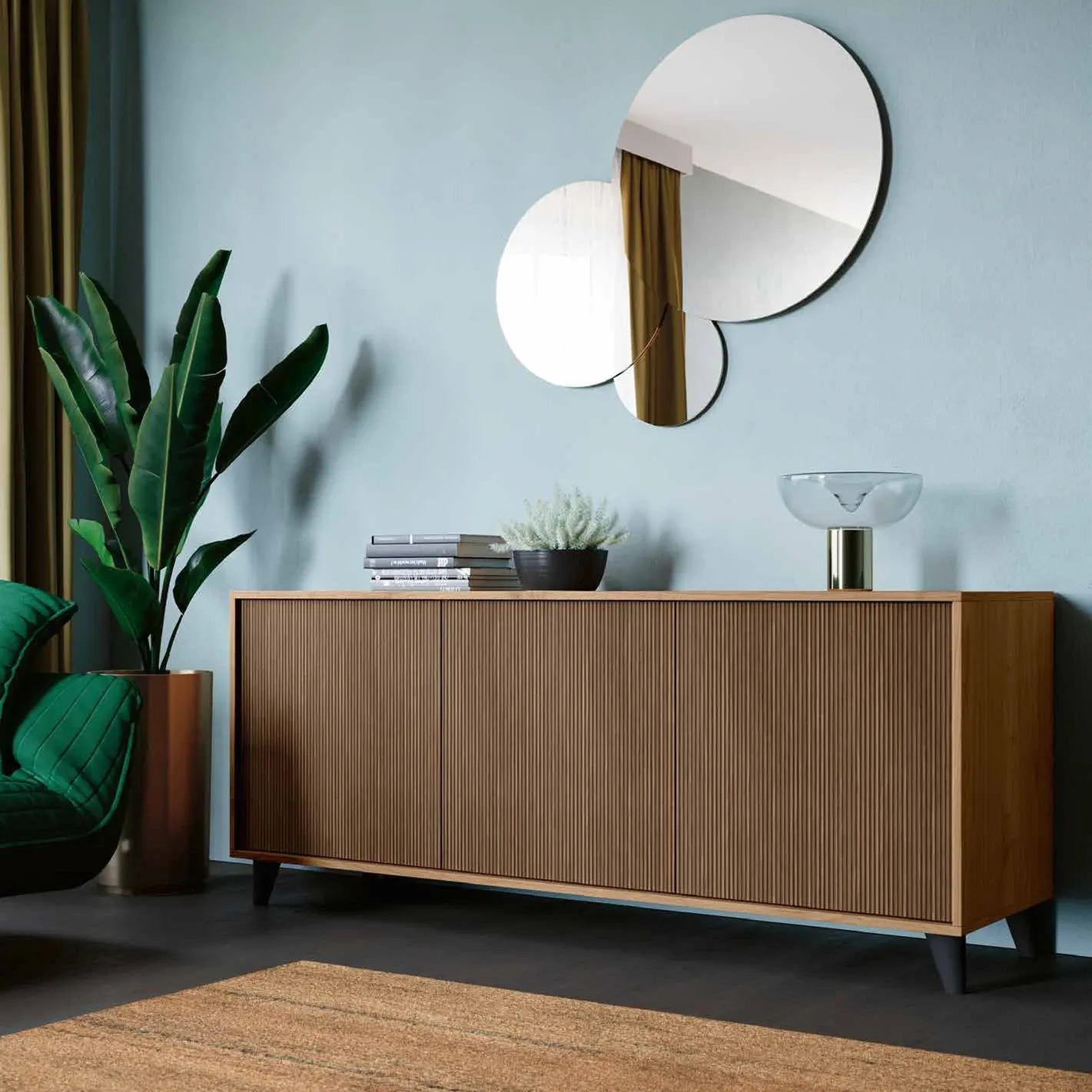 La credenza, dotata di tre ante, assicura una notevole capienza per mantenere l'ambiente ordinato e funzionale.