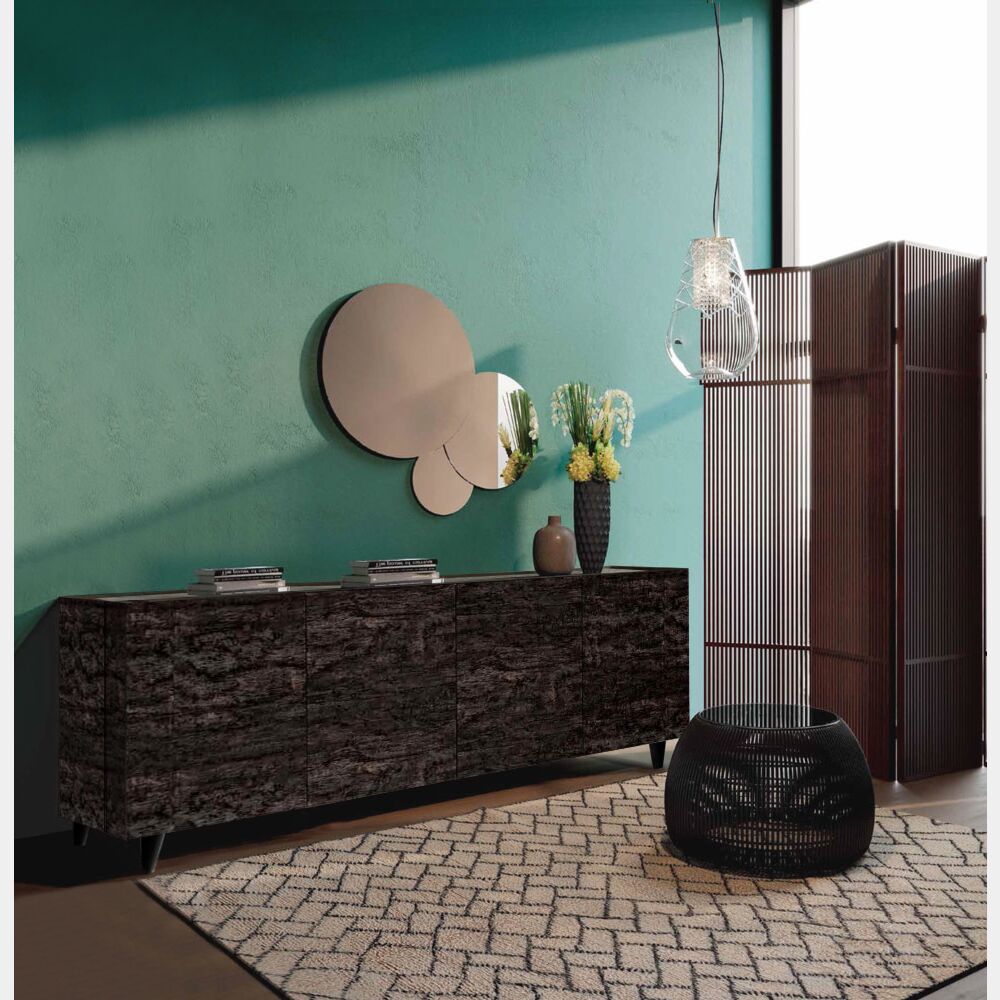 Note vintage ed essenze si incontrano in una proposta di madia bifacciale, disponibile da 180 e 240 cm, con ante spessore 22 mm e aperture facilitata a 180°.