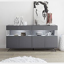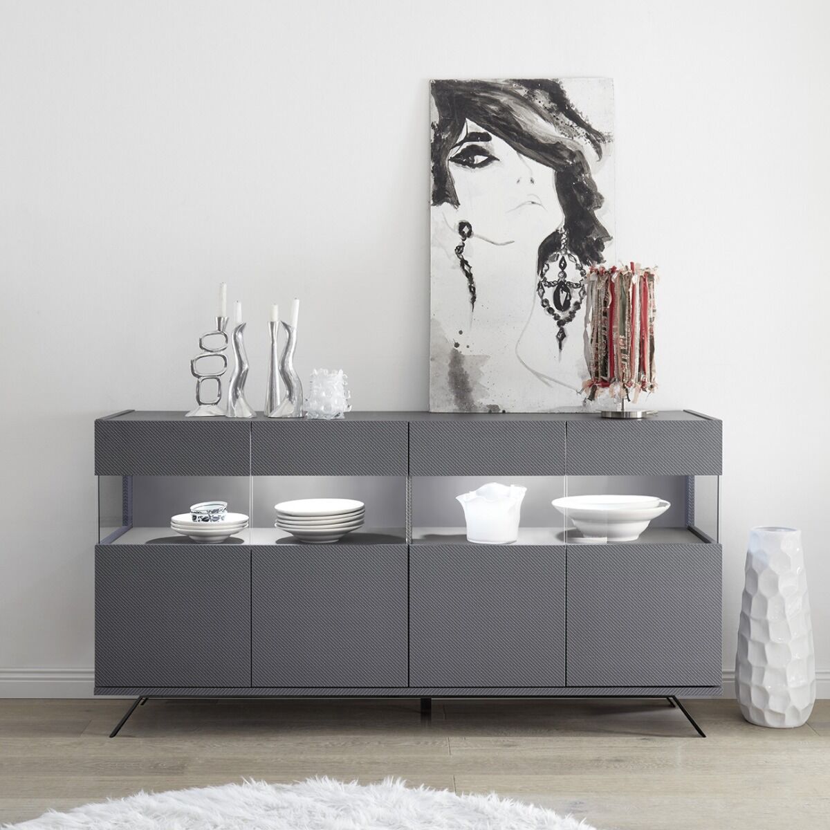 Madia 4 ante moderna in finitura carbonio e inserto in vetro temperato da 4 mm e piedino in ferro. Questa madia fa parte della collezione Elite, collezione di alta qualità. Spessori sono da 22 mm, ante con chiusura ammortizzata e piedini in ferro. L'interno è tutto grigio opaco.Come optional su questa madia possibilità di aggiungere il led all'interno della parte a vetro per dare maggiore risalto ai vostri oggetti.Misure: L.184 H.95 P.50IL TESSUTO BLACK & WHITE è un optional e costa 99,00 Euro