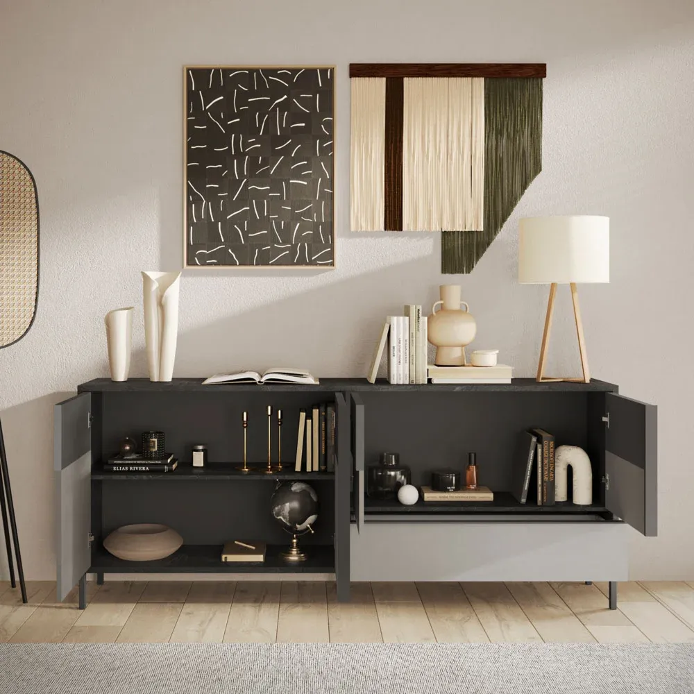 La credenza non passa inosservata grazie alle sue moderne finiture in Piombo/Gesso/Ardesia. E' una credenza molto capiente, composta da ben 4 ante battenti e da un cassetto utile per riporre i propri oggetti. Al suo interno presenta dei ripiani utili per appoggiare libri, puzzle, apparecchi elettronici in ordine. E' un mobile 100% Made in Italy e di qualità.