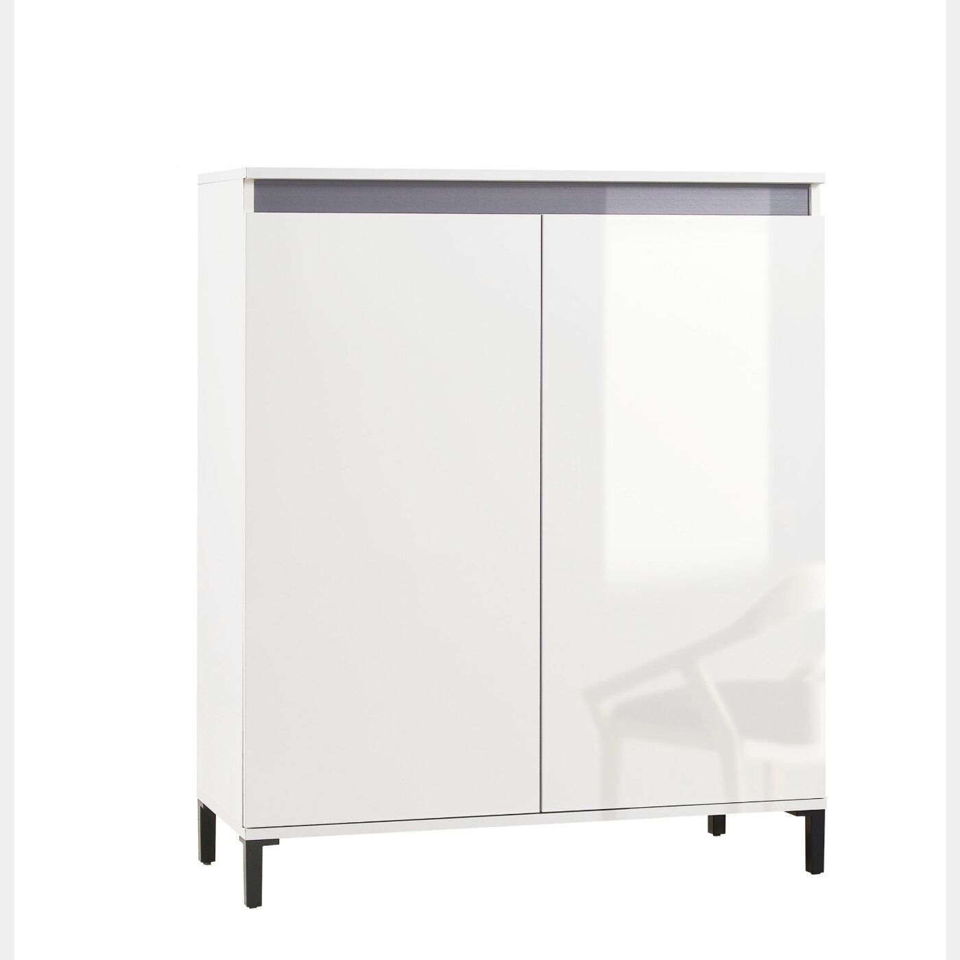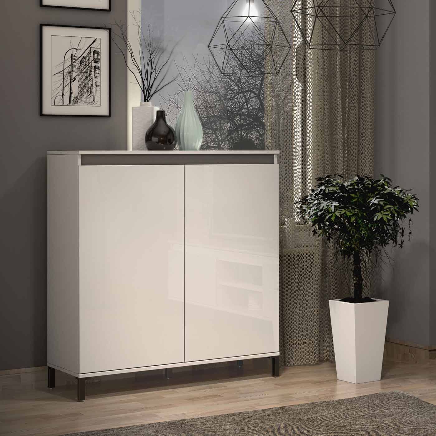 La Madia moderna multiuso a 2 ante Bianco lucido con dettaglio Ardesia renderà i tuoi ambienti moderni e funzionali ed è utilizzabile anche come scarpiera.