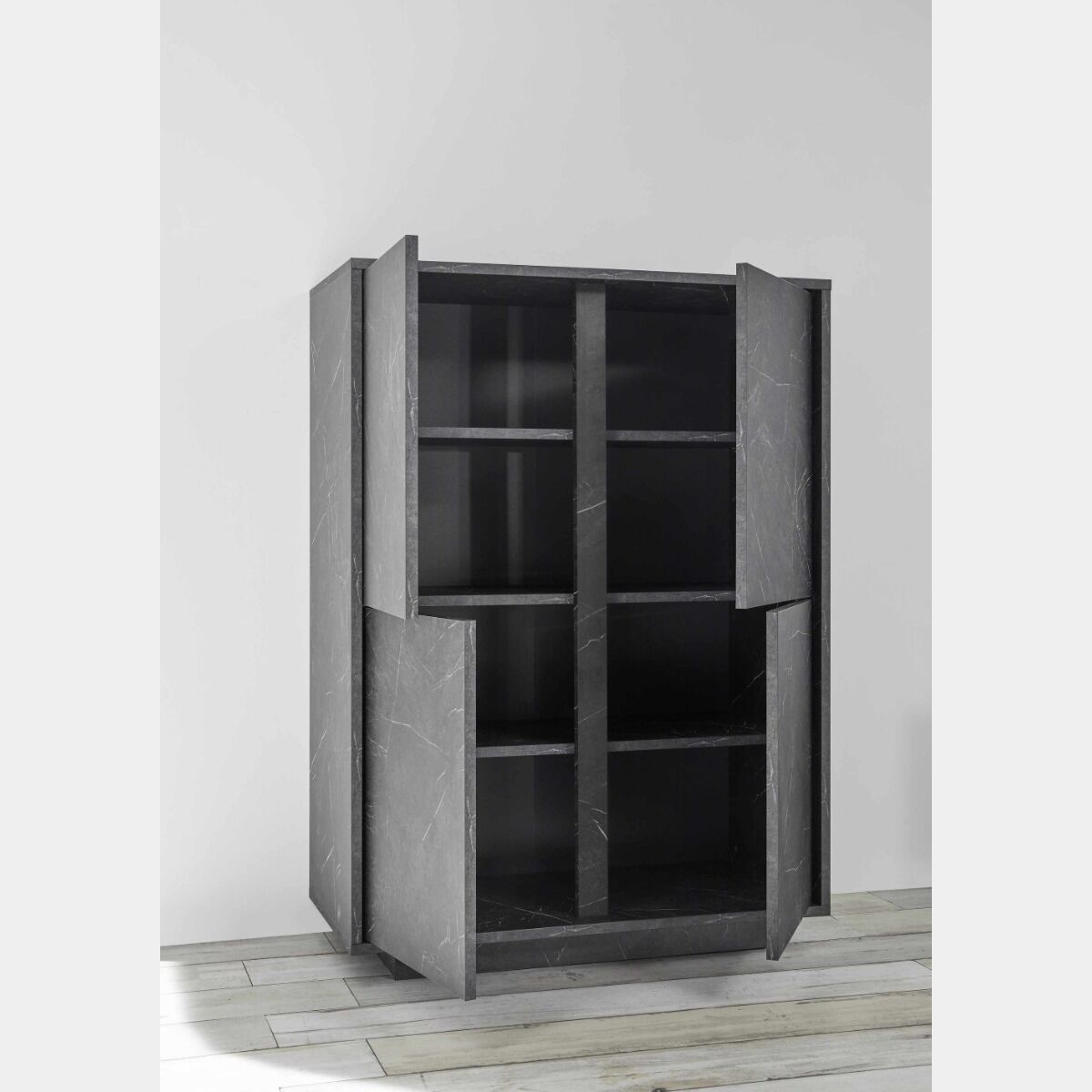 Madia alta moderna, 4 ante in finitura effetto Marmo Nero di Carrara