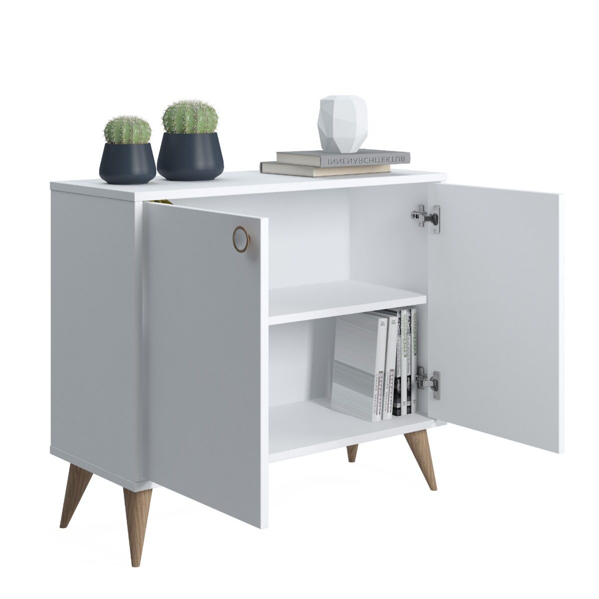 La madia Ankara presenta 2 ante battenti con un ripiano centrale interno. Il suo design semplice consente un arredo sobrio e moderno. Dettagli come i piedini a cono in Rovere che riprendono il bordo delle maniglie tonde assicurano un piacevole impatto visivo.
