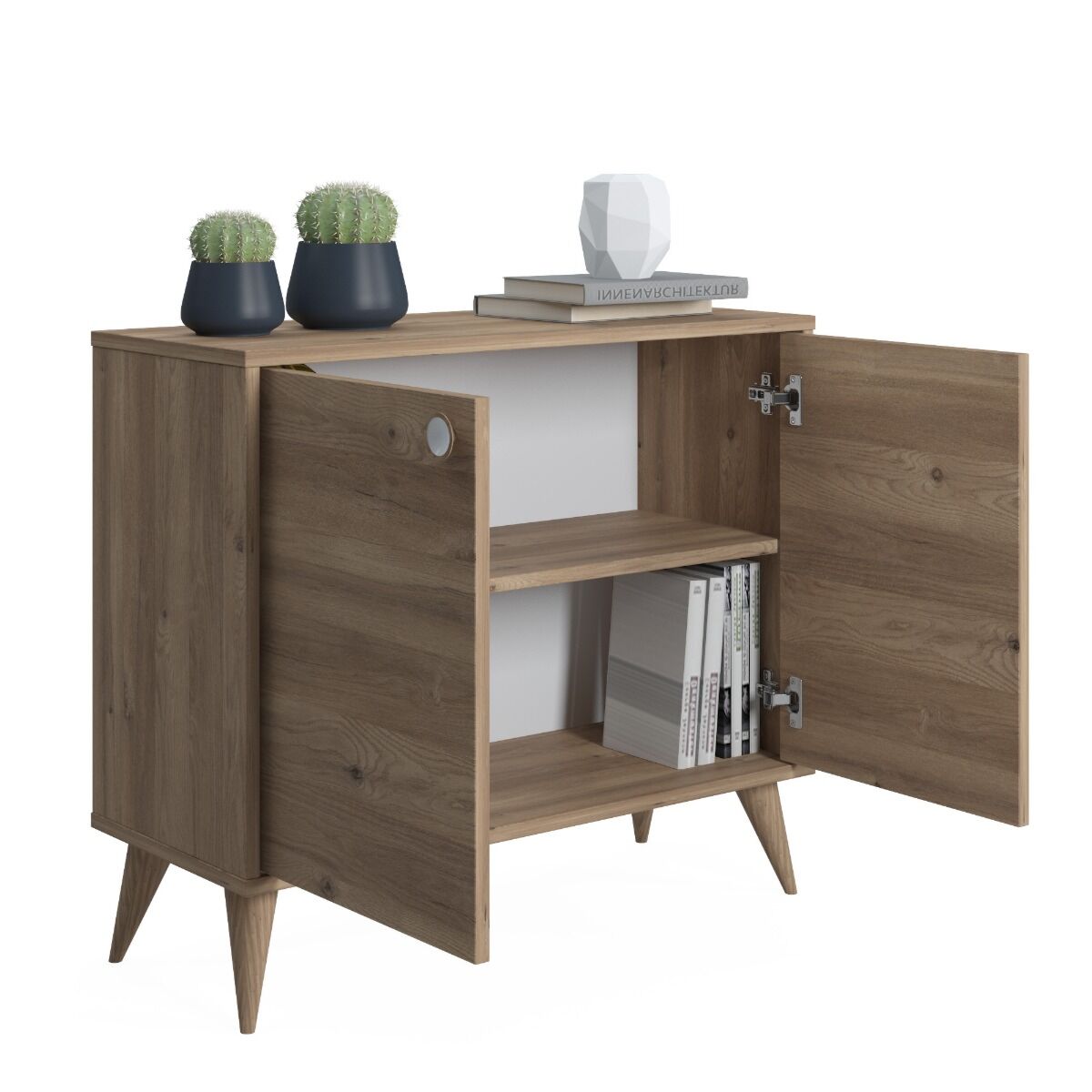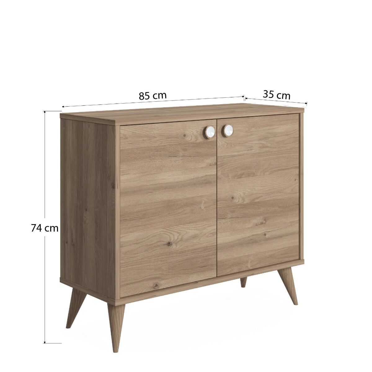 Il suo design semplice consente un arredo sobrio e moderno. Dettagli come i piedini a cono in Rovere che riprendono la finitura della struttura e del bordo delle maniglie tonde assicurano un piacevole impatto visivo. La madia Ankara presenta 2 ante battenti con un ripiano centrale interno.