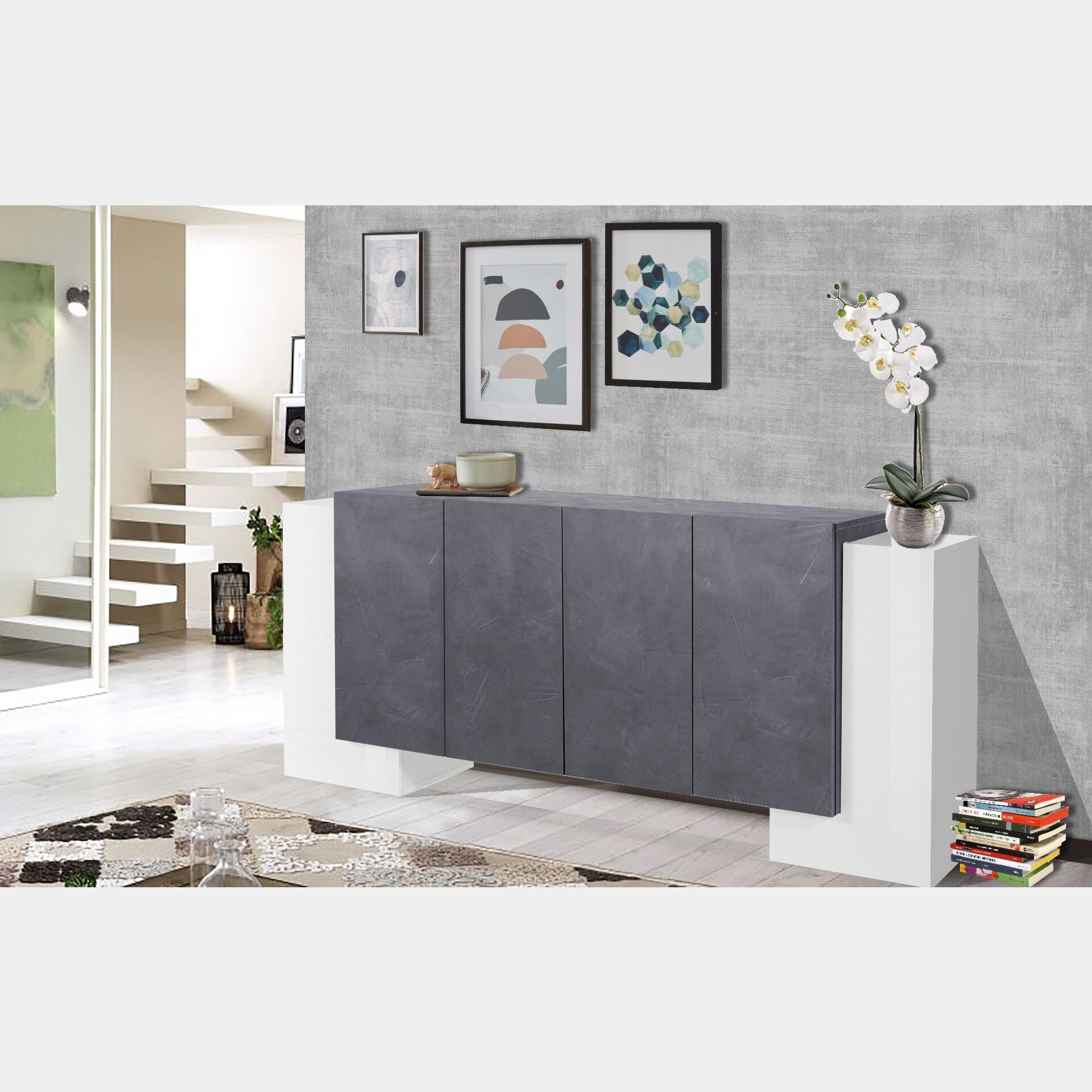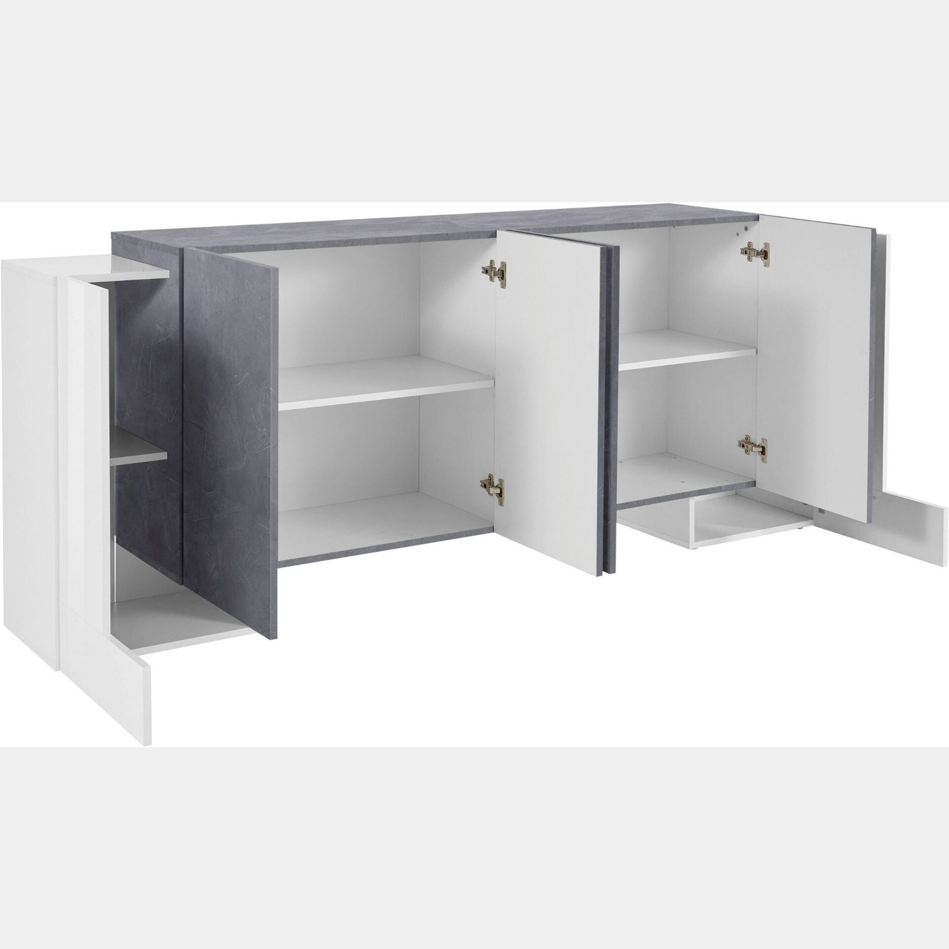 La madia è composta da 6 ante battenti, le 2 esterne in Bianco lucido mentre le centrali in Ardesia, tutte dotate di un ripiano centrale interno. Questa suddivisione dello spazio assicura una totale funzionalità e garantisce un ampio piano di appoggio.