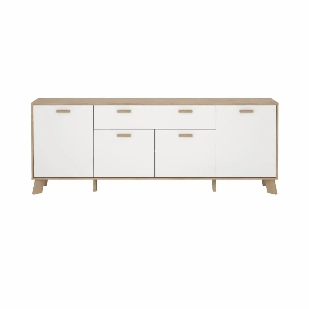 Nuova madia moderna composta da un cassetto disponibile a contenere tutti i vostri oggetti al meglio, composta da tre ripiani e da quattro ante battenti. Quest'ultime sono accompagnate da una maniglia che garantisce un facilo e accesso e allo stesso tempo dona un tocco di eleganza.