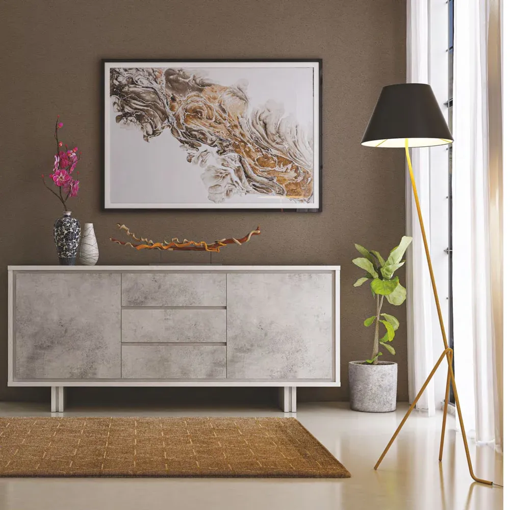 Madia colore Bianco frassino e Cemento costituito da due ante battenti e tre cassetti. E' disponibile anche in versione Cemento, Olmo perla, Bianco seta, Bianco lucido, Bianco frassino, Visone.